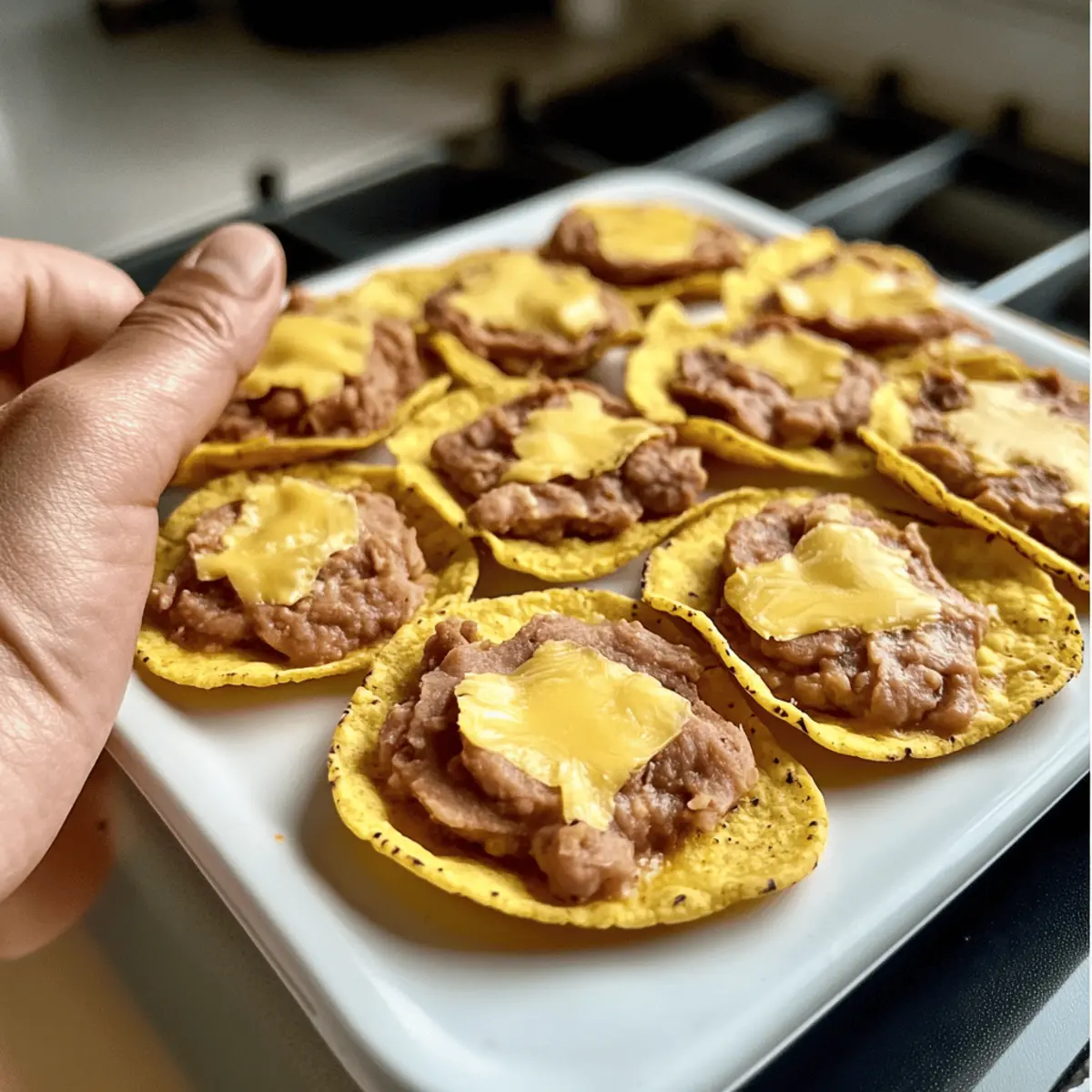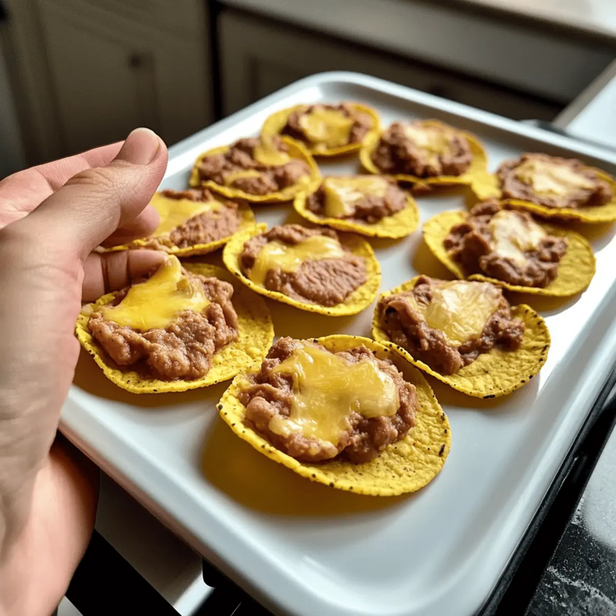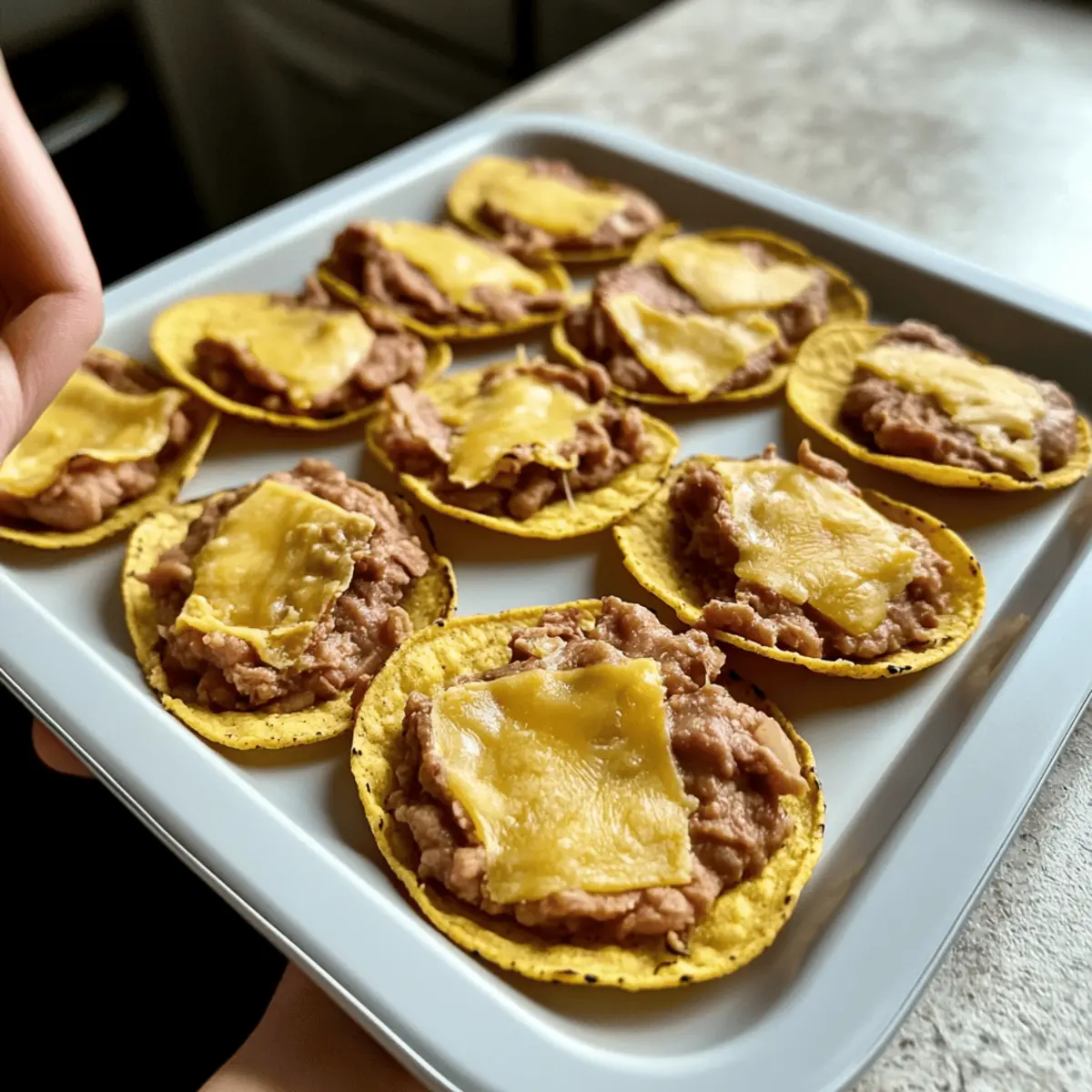 Begin by preheating your oven to 350°F (175°C) and lining a baking sheet with parchment paper or a silicone mat. This will ensure your Bean and Cheese Taco Bites don’t stick and bake evenly. While the oven warms up, gather your tortilla chips and refried beans, so you’re ready to assemble your delicious snacks.