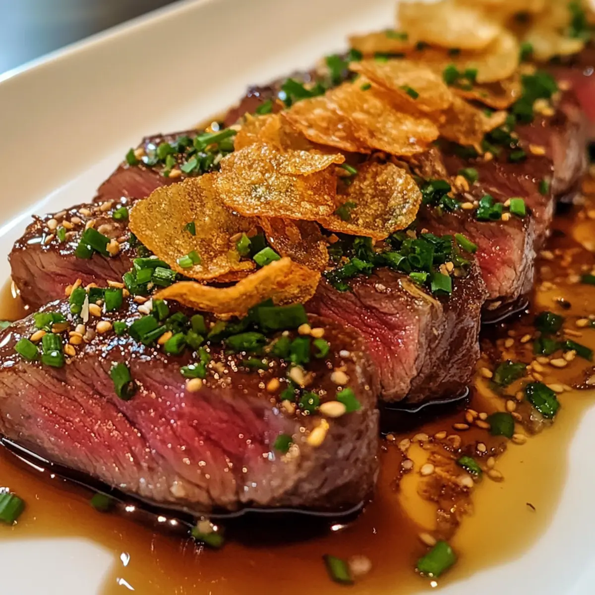 These Beef Tataki with Garlic Chips & Ponzu are ideal for busy home cooks looking to save time! You can sear the filet mignon up to 24 hours in advance and chill it, wrapped tightly in plastic wrap, to maintain that melt-in-your-mouth tenderness. The ponzu sauce can be prepared and stored in the refrigerator for up to 3 days, allowing the flavors to meld beautifully. For the crispy garlic chips, they can be fried ahead of time and stored in an airtight container for up to a week, ensuring they stay crunchy. When you’re ready to serve, simply slice the chilled beef, drizzle with ponzu, and finish with garlic chips and chives for an impressive appetizer that tastes just as delicious as if it were freshly made!
