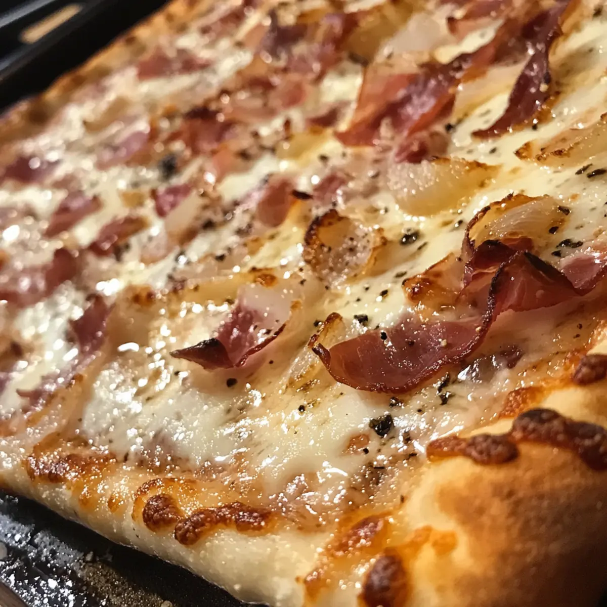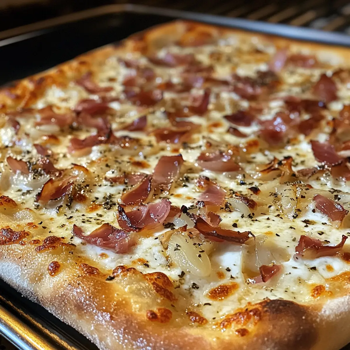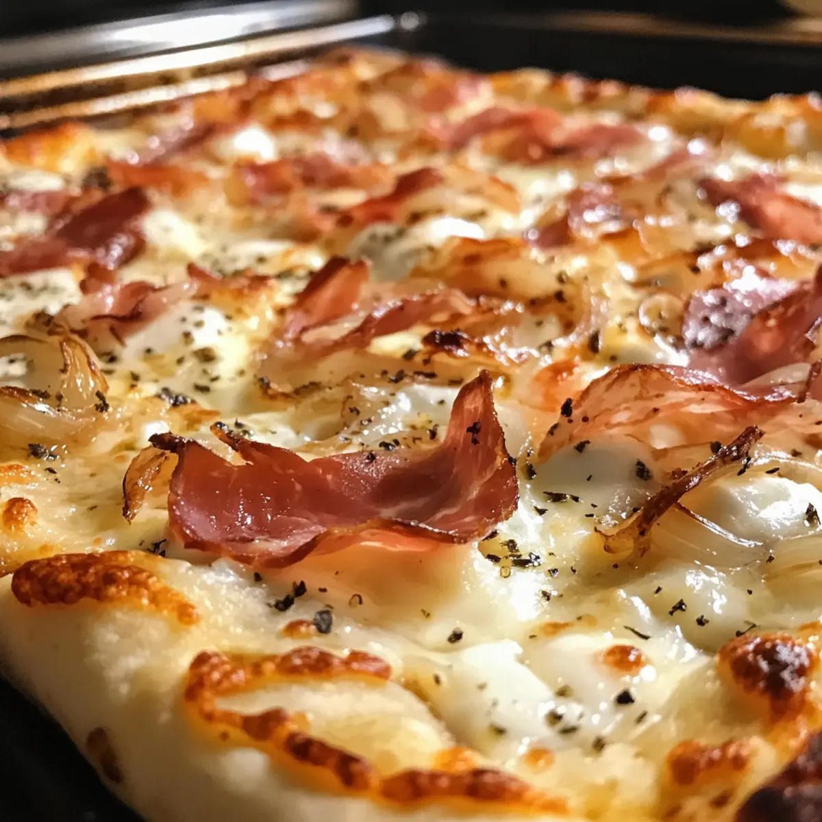 - Spread shredded mozzarella cheese evenly over the dough, add prosciutto, drizzle with cream sauce, and scatter caramelized onions.