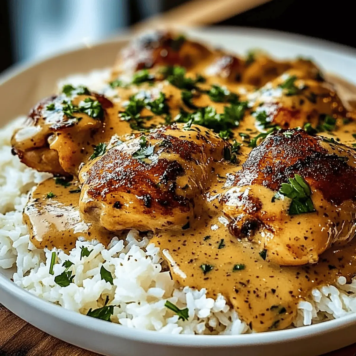 To serve, scoop a generous amount of fluffy rice onto each plate, followed by a few chicken thighs drenched in the luscious gravy. Garnish with freshly chopped parsley for a pop of color and flavor. Enjoy this comforting meal with a side of your choice, perfect for cozy evenings at home.