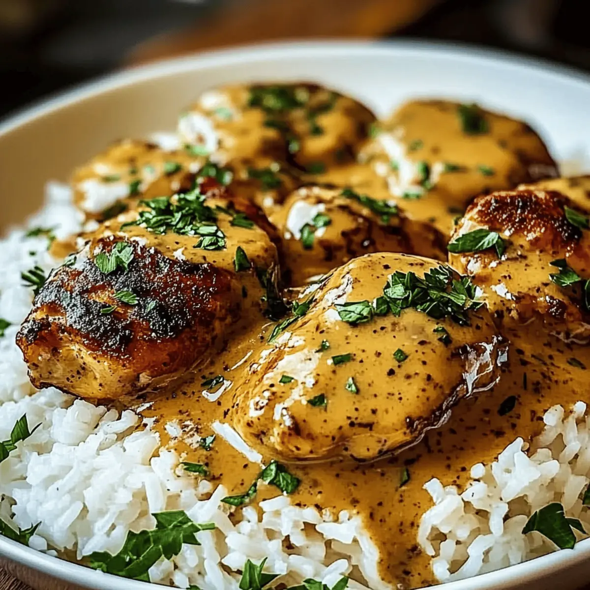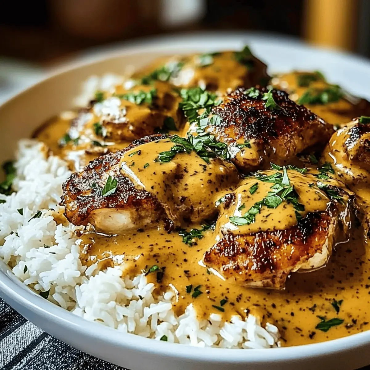 - To serve, scoop a generous amount of fluffy rice onto each plate, followed by a few chicken thighs drenched in the luscious gravy. Garnish with freshly chopped parsley for a pop of color and flavor. Enjoy!