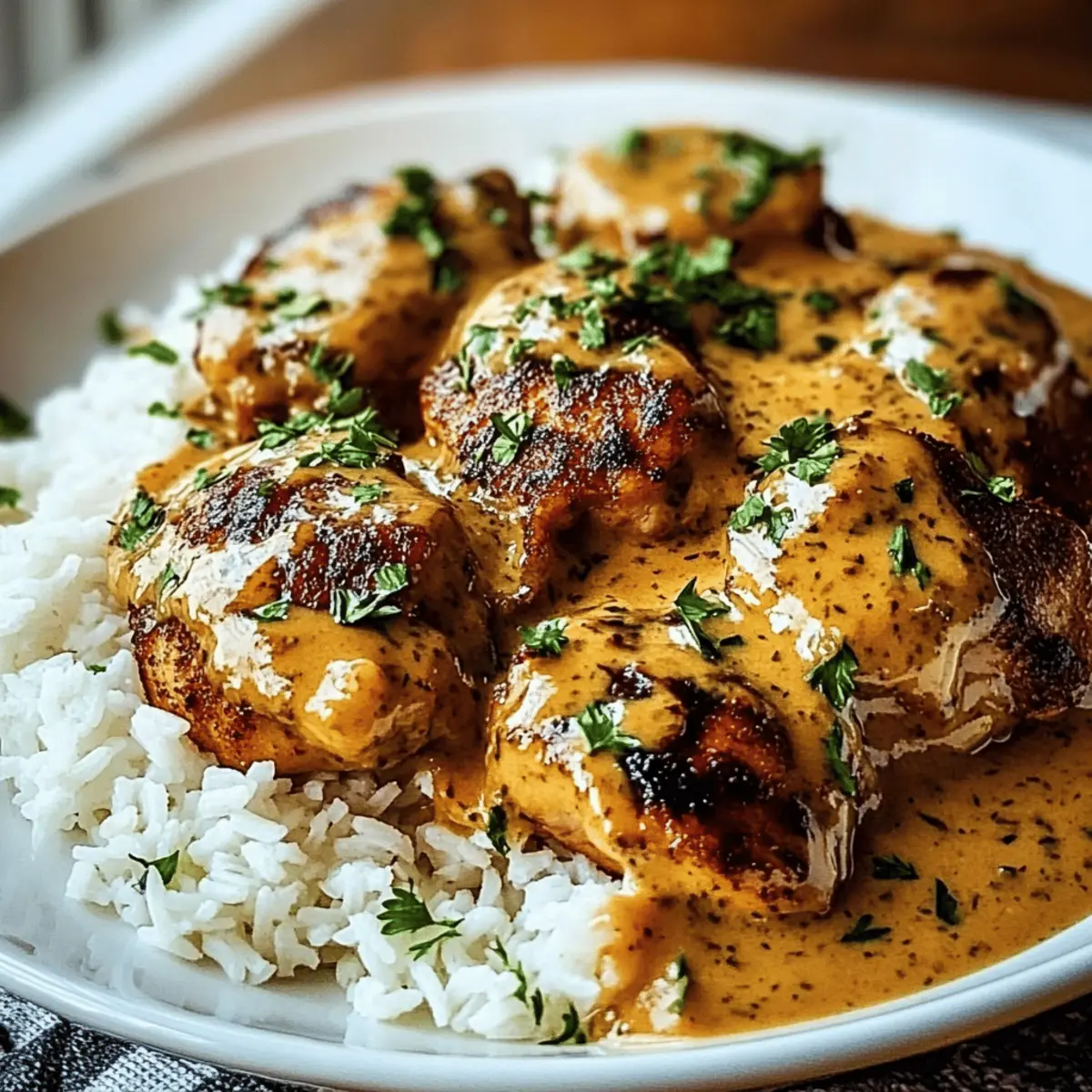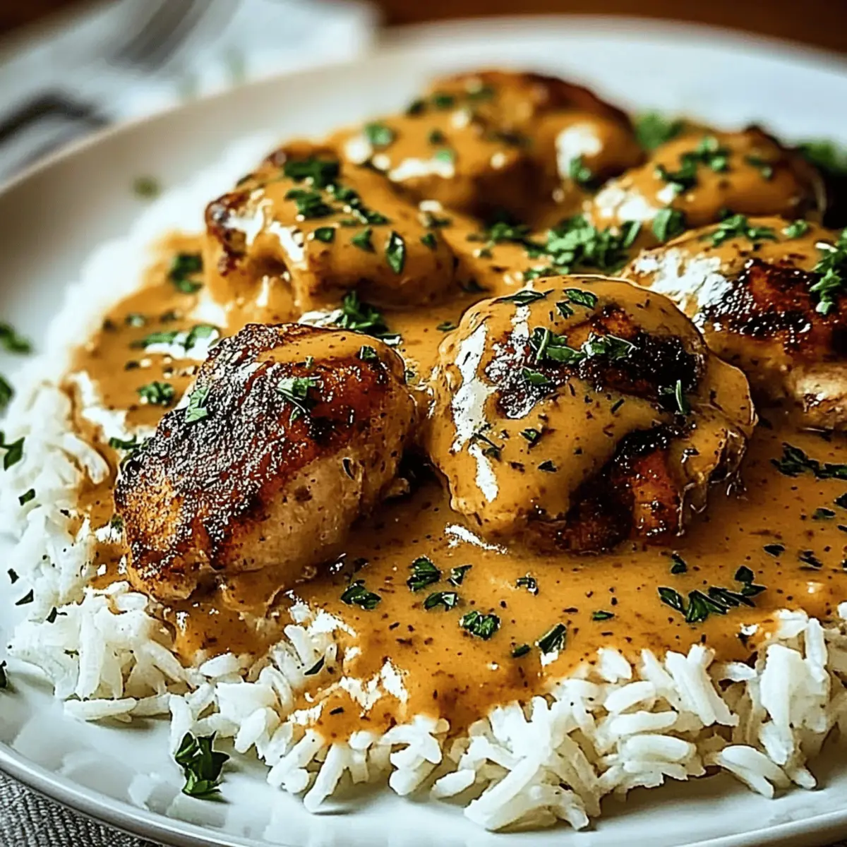 - Serve the smothered chicken over the fluffy white rice, ladling plenty of creamy gravy on top and garnishing with chopped parsley.