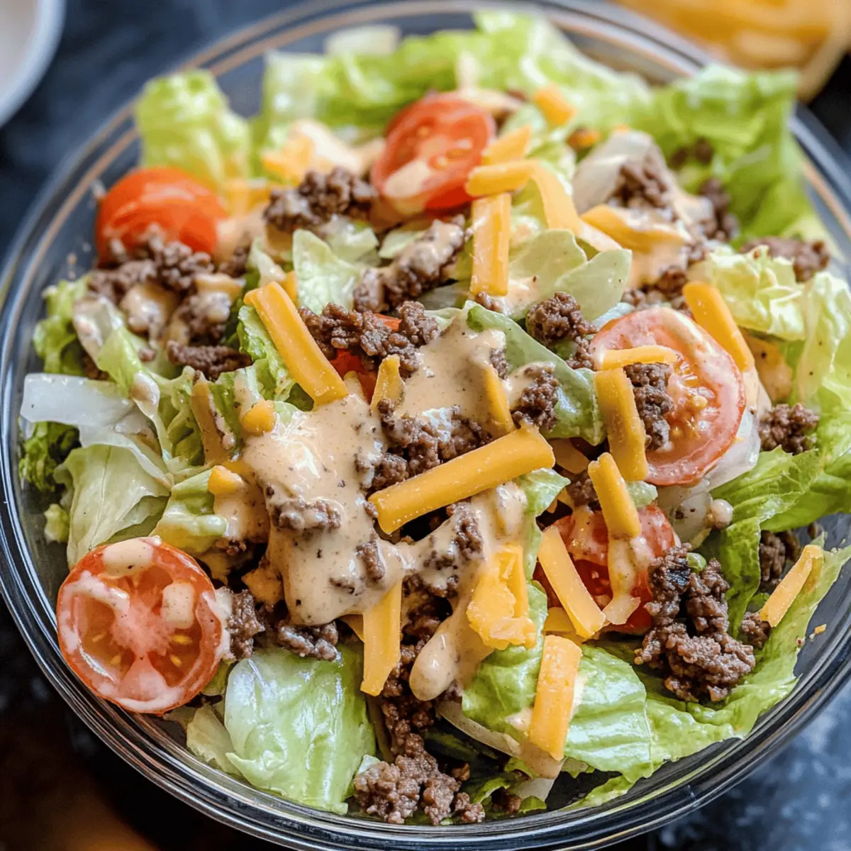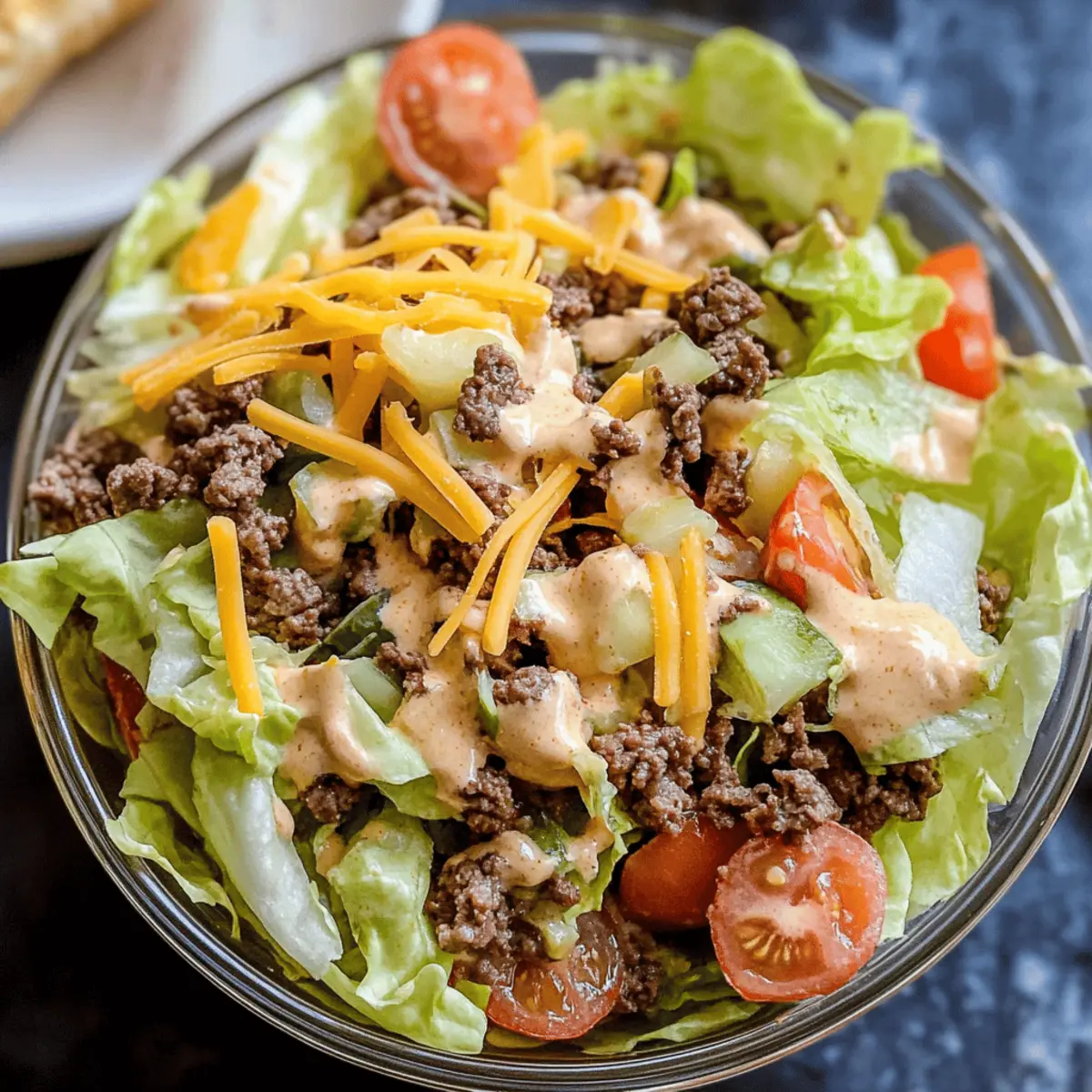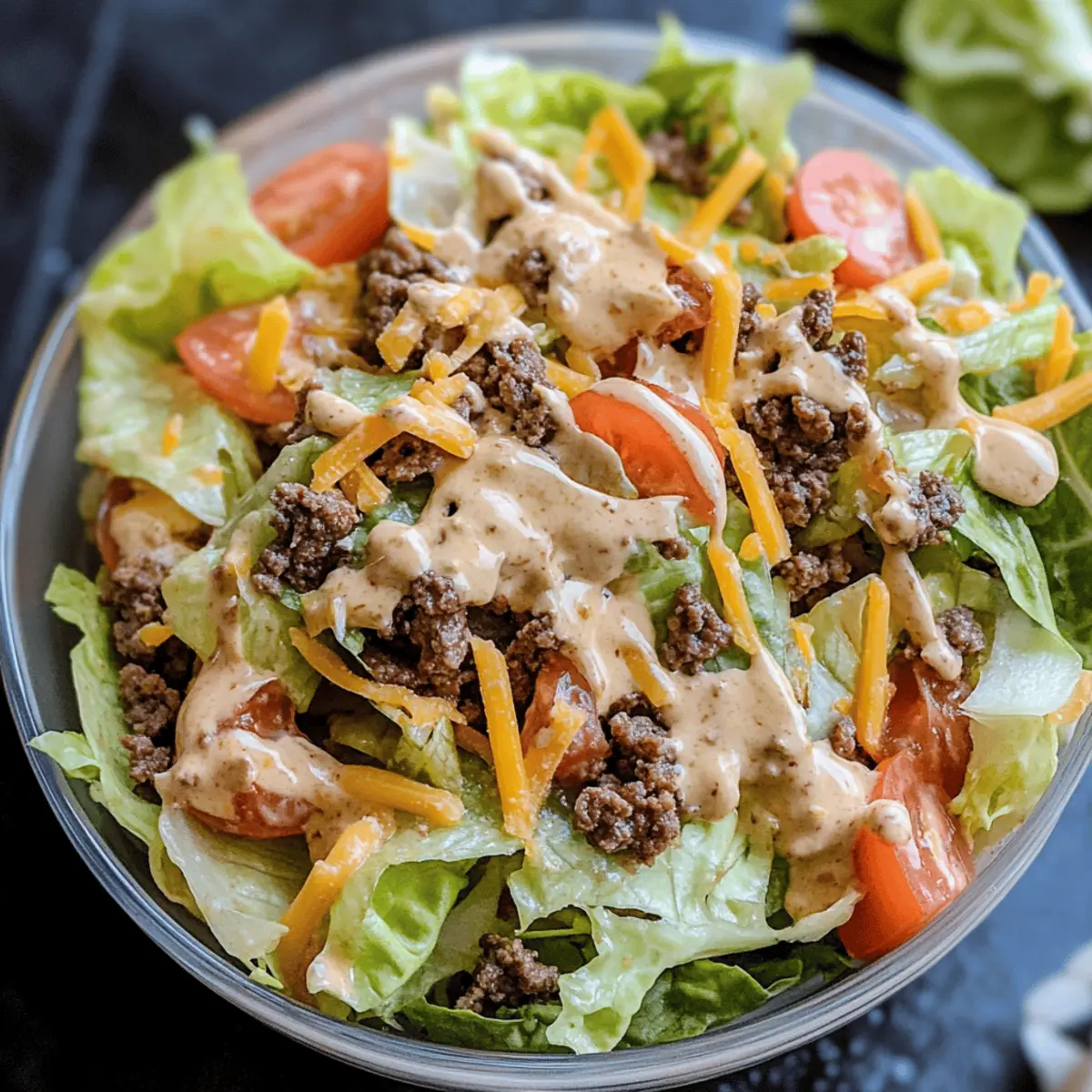 Transfer the Big Mac Salad into individual bowls or a large serving platter, and enjoy right away while it’s fresh. If preparing ahead, keep the dressing separate until ready to serve to maintain the crispness of the ingredients. This delightful salad is perfect for a quick lunch or dinner while sticking to your healthy eating goals!