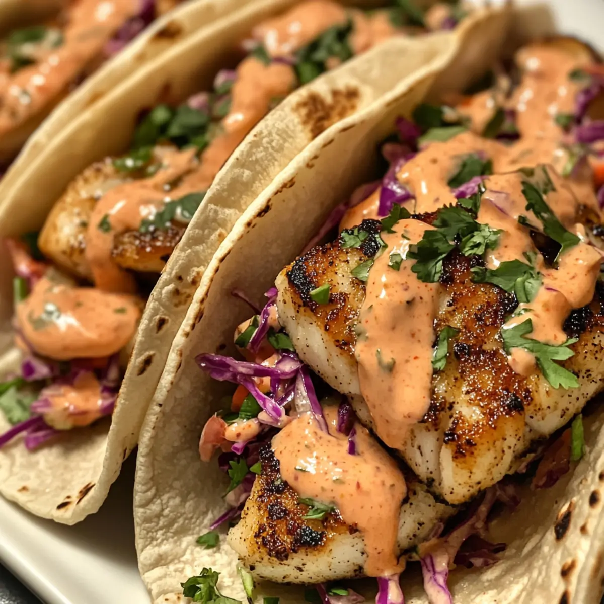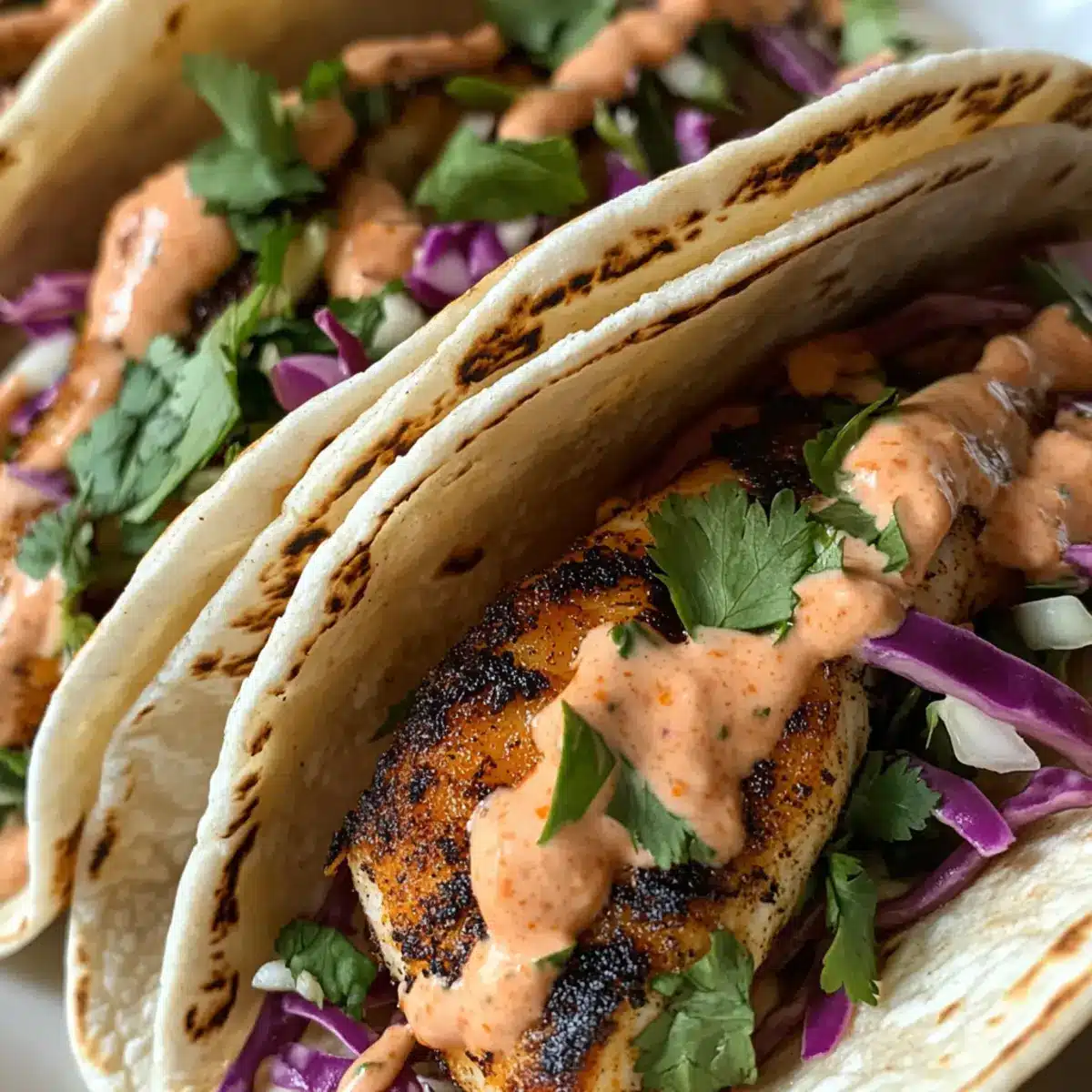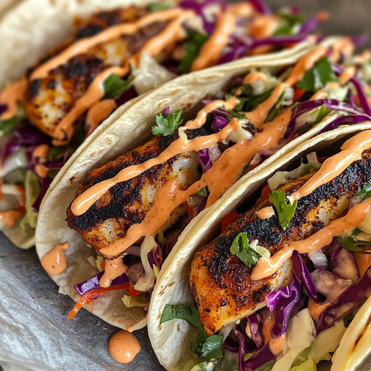 Blackened Fish Tacos with Cilantro Slaw and Zesty Sriracha Mayo