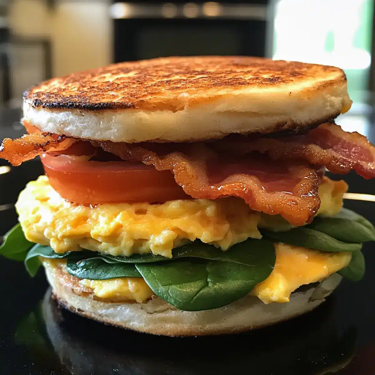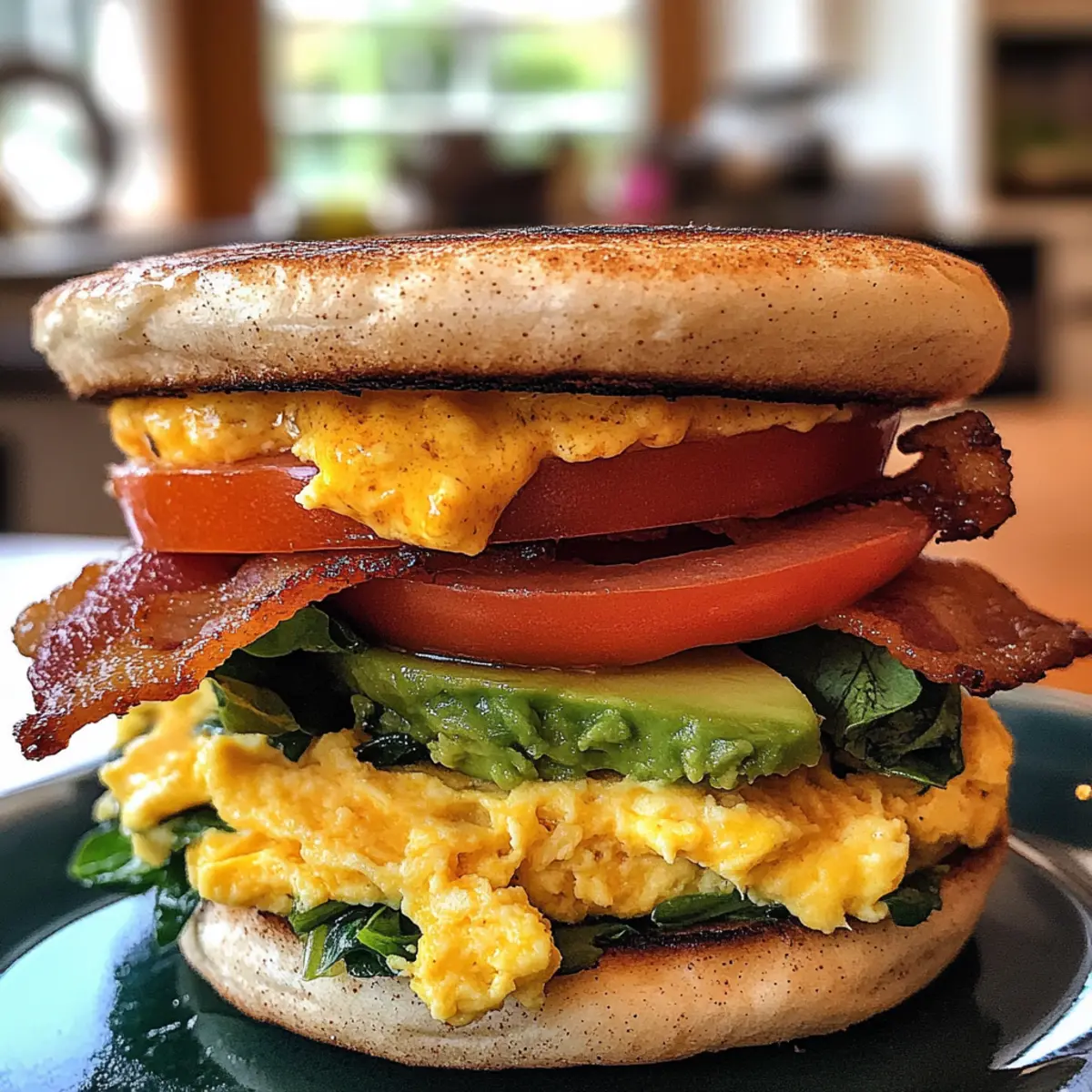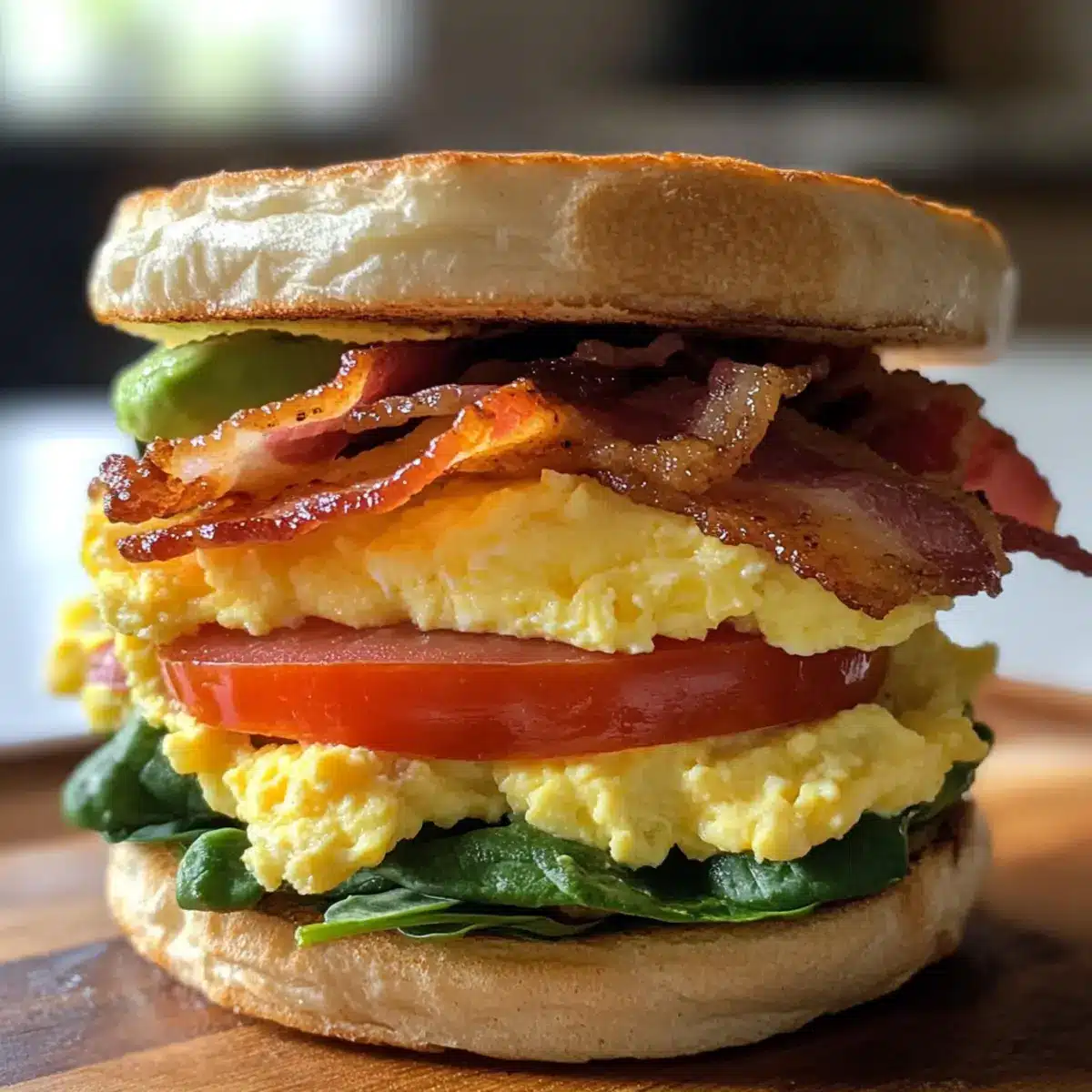 5. Assemble the sandwiches by placing scrambled eggs on each muffin half, adding bacon and avocado. Top with cheddar cheese, tomato slices, and spinach if desired, then add the other muffin half.