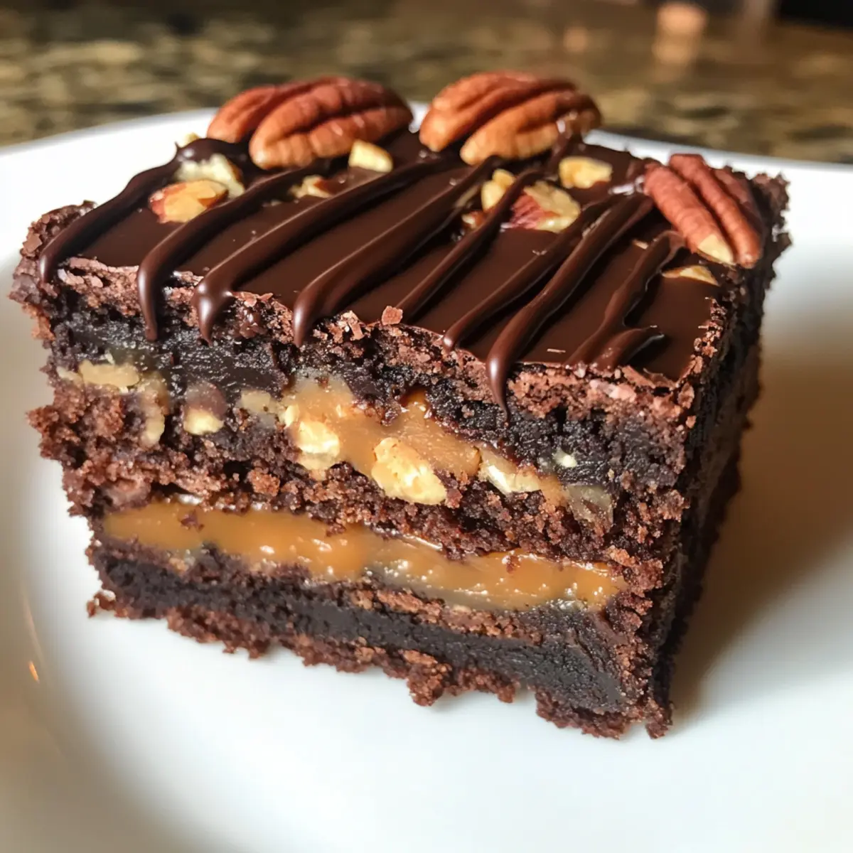 Delight in Buckeye Turtle Brownies, a gluten-free treat with rich chocolate, creamy peanut butter, and gooey caramel pecan topping.