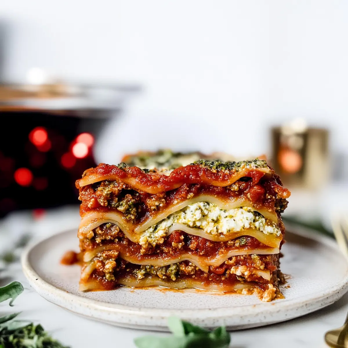 Festive Delight: This Christmas Eve Lasagna is a stunning centerpiece that beautifully showcases holiday colors with rich reds, greens, and creamy whites.