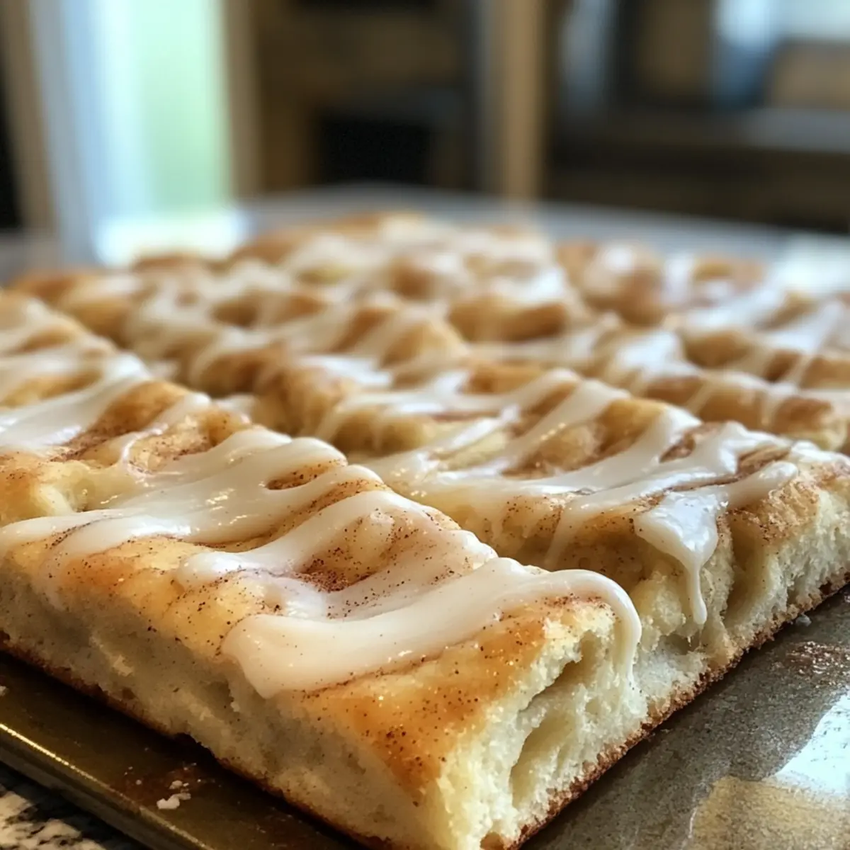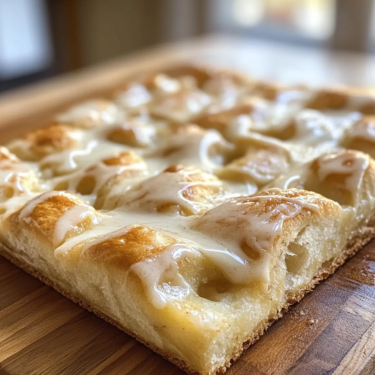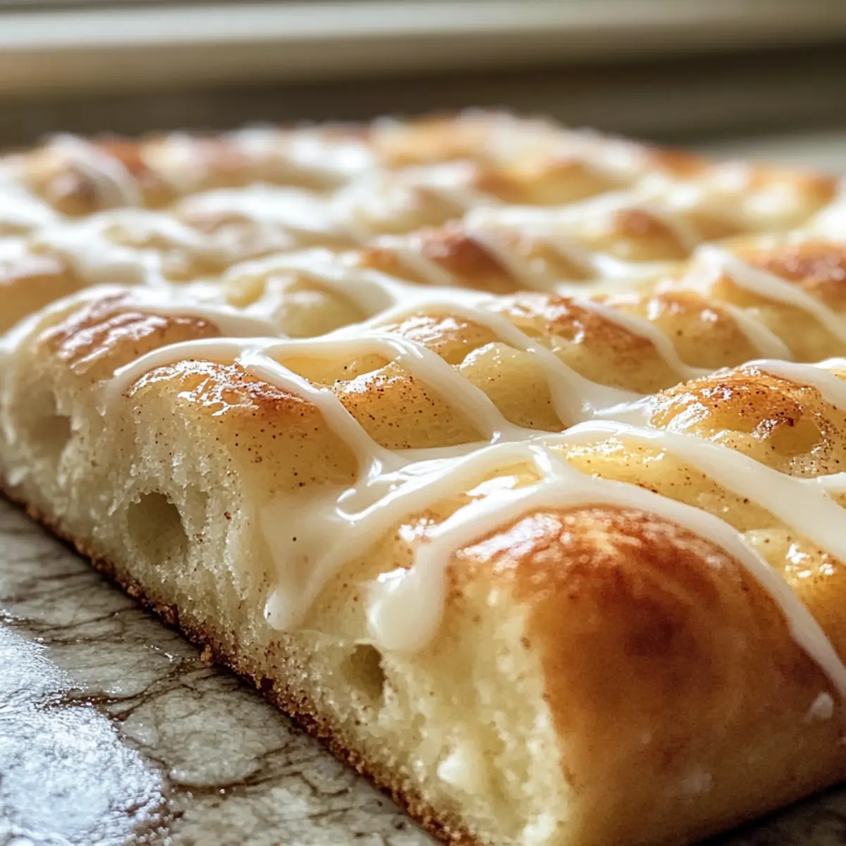 While the focaccia cools, prepare the simple vanilla icing by whisking together 1 cup of sifted powdered sugar, 2½ tablespoons of milk, and 1 teaspoon of vanilla extract until smooth and creamy. Once the focaccia has cooled slightly, drizzle the icing over the warm bread, allowing it to melt into the nooks, and then slice into delightful pieces.