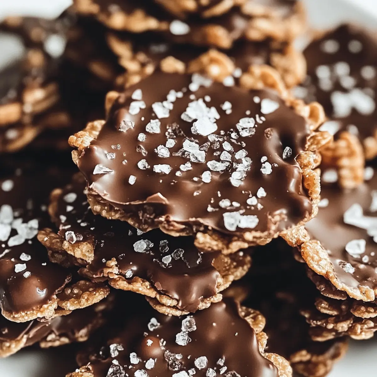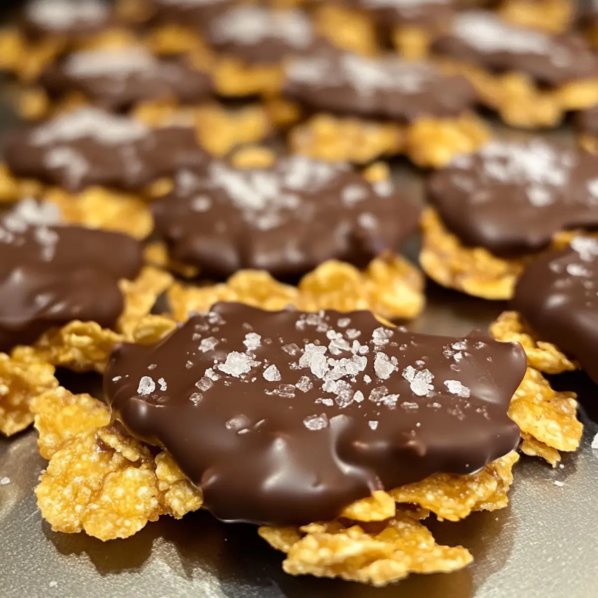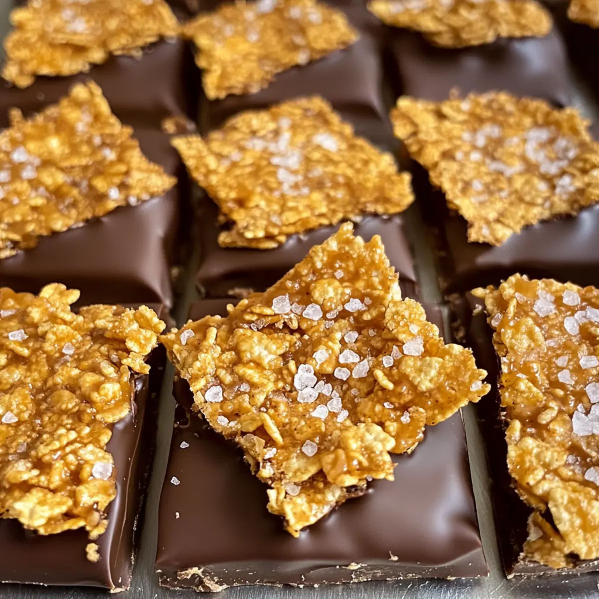 Take each piece of your Cornflake Crack Crunch and dip half of it into the melted chocolate. Allow any excess chocolate to drip off before placing it on a wire rack or parchment paper. While the chocolate is still wet, sprinkle a pinch of flaky sea salt on top for that perfect sweet and salty touch.