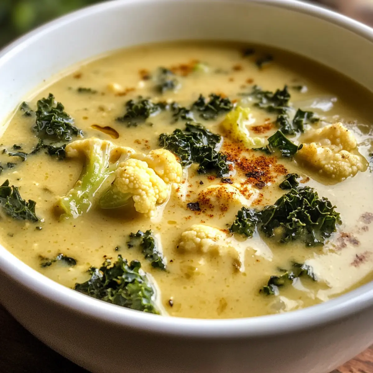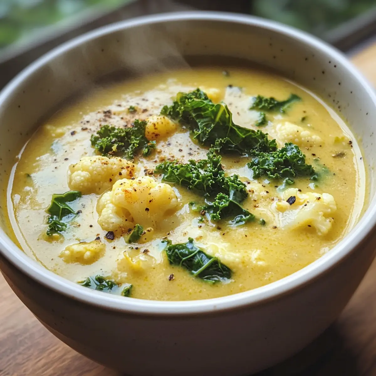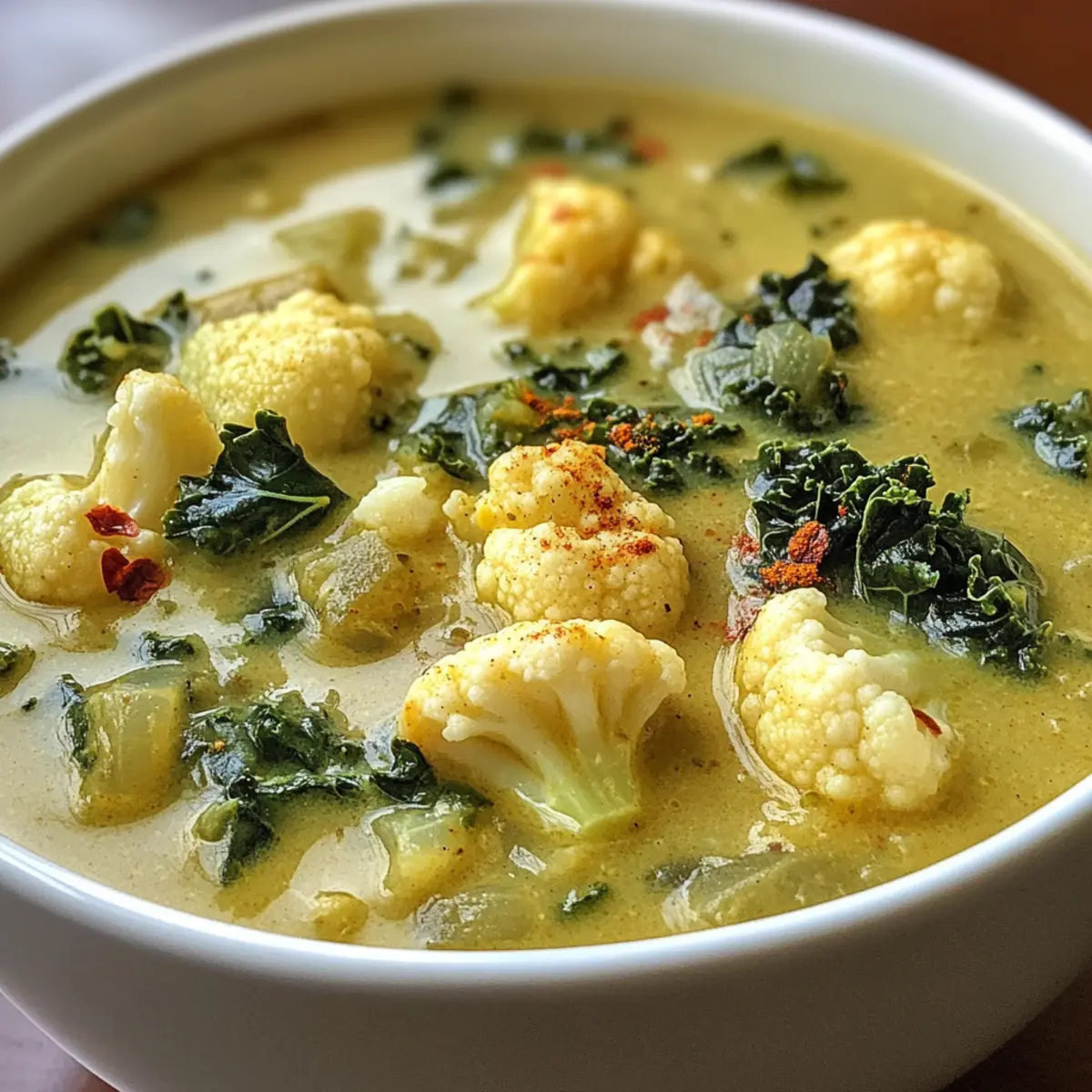 Comforting: Each spoonful of this Curried Cauliflower and Kale Soup envelops you in warmth and rich flavor, perfect for chilly nights.