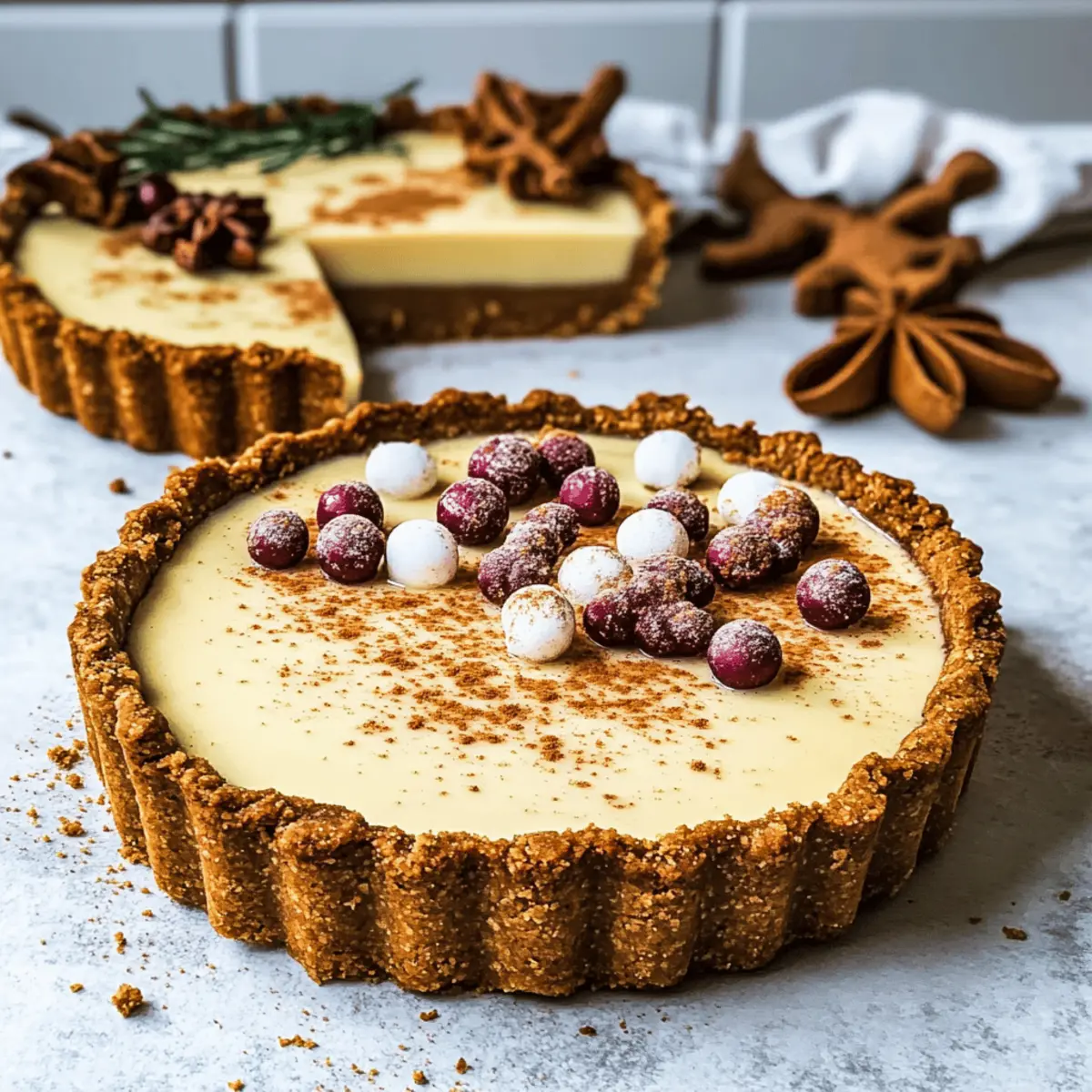Indulge in this creamy Eggnog Pie that features a gingerbread crust, perfect for holiday gatherings.