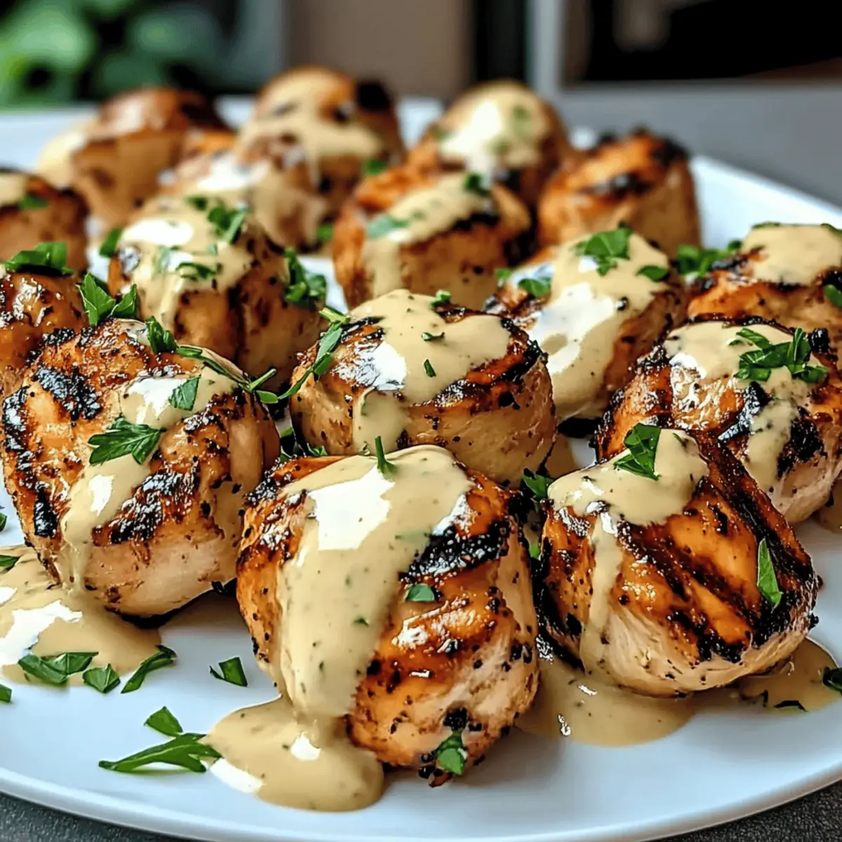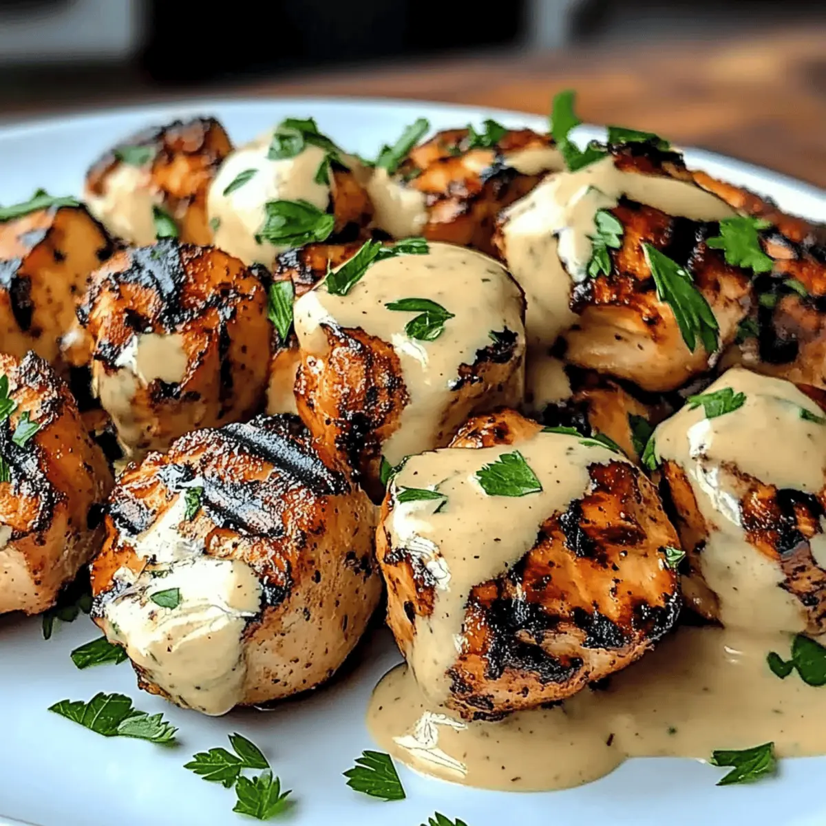 Once fully cooked, remove the grilled chicken bites from the heat and let them rest for a couple of minutes. Arrange the tender bites on a serving platter and drizzle generously with the creamy garlic sauce. Garnish with additional parsley if desired, and serve them warm with your choice of sides or as a savory appetizer to share.