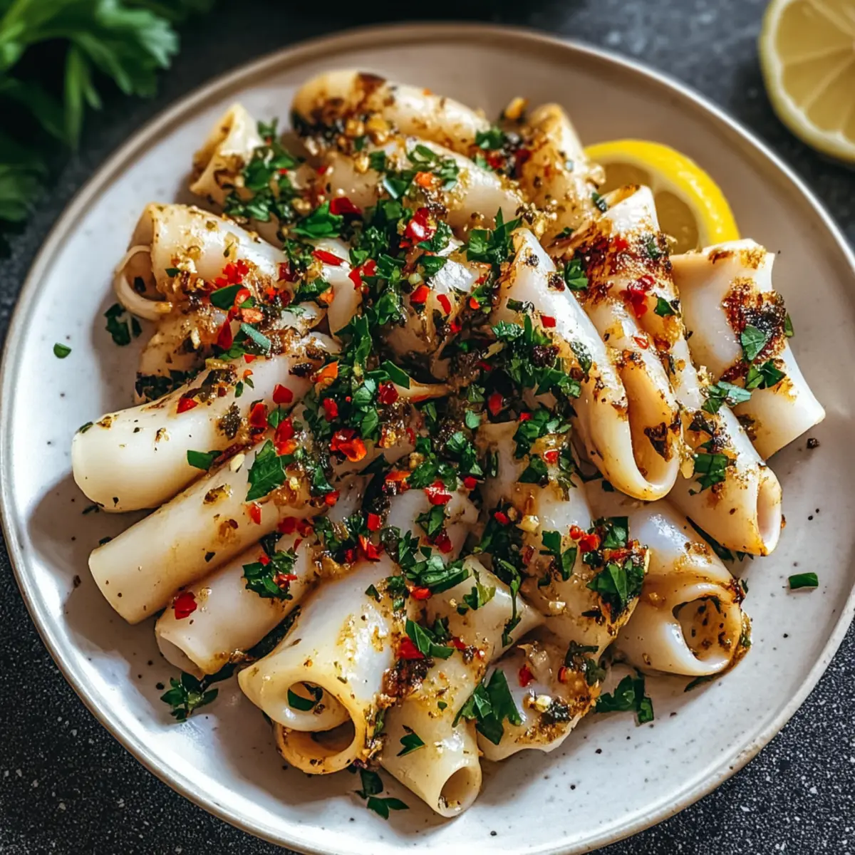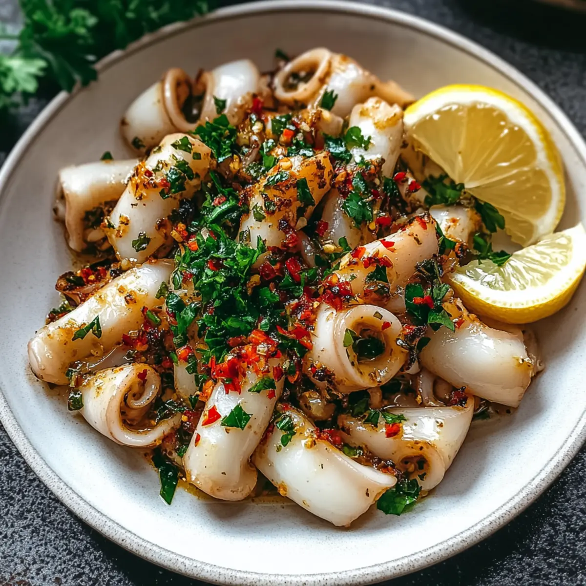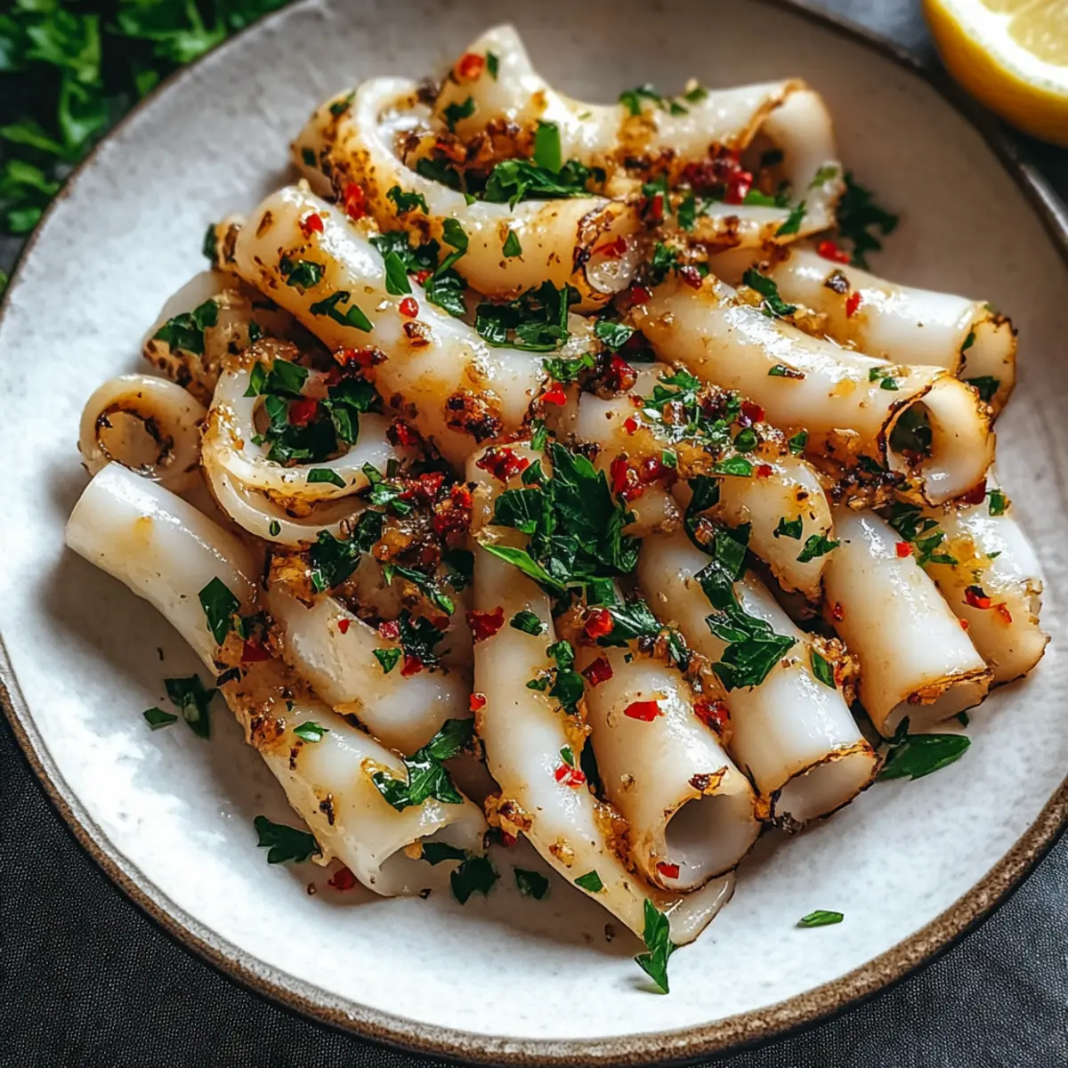 Fresh, Flavorful Ingredients: This recipe highlights fresh squid that delivers a sweet, tender texture, ideal for any seafood lover. Quick Preparation: In just 20 minutes, you’ll prepare a dish that doesn’t compromise on flavor or nutrition, making it perfect for busy weeknights. Mediterranean Delight: The garlic and chili combination infuses each bite with vibrant Mediterranean flair—perfect for those craving a taste of the coast. Versatile Pairings: Serve it with a light salad or crusty bread to soak up the delicious sauce, giving you flexible dining options. Elevate your home cooking and impress guests with a dish that rivals any restaurant!