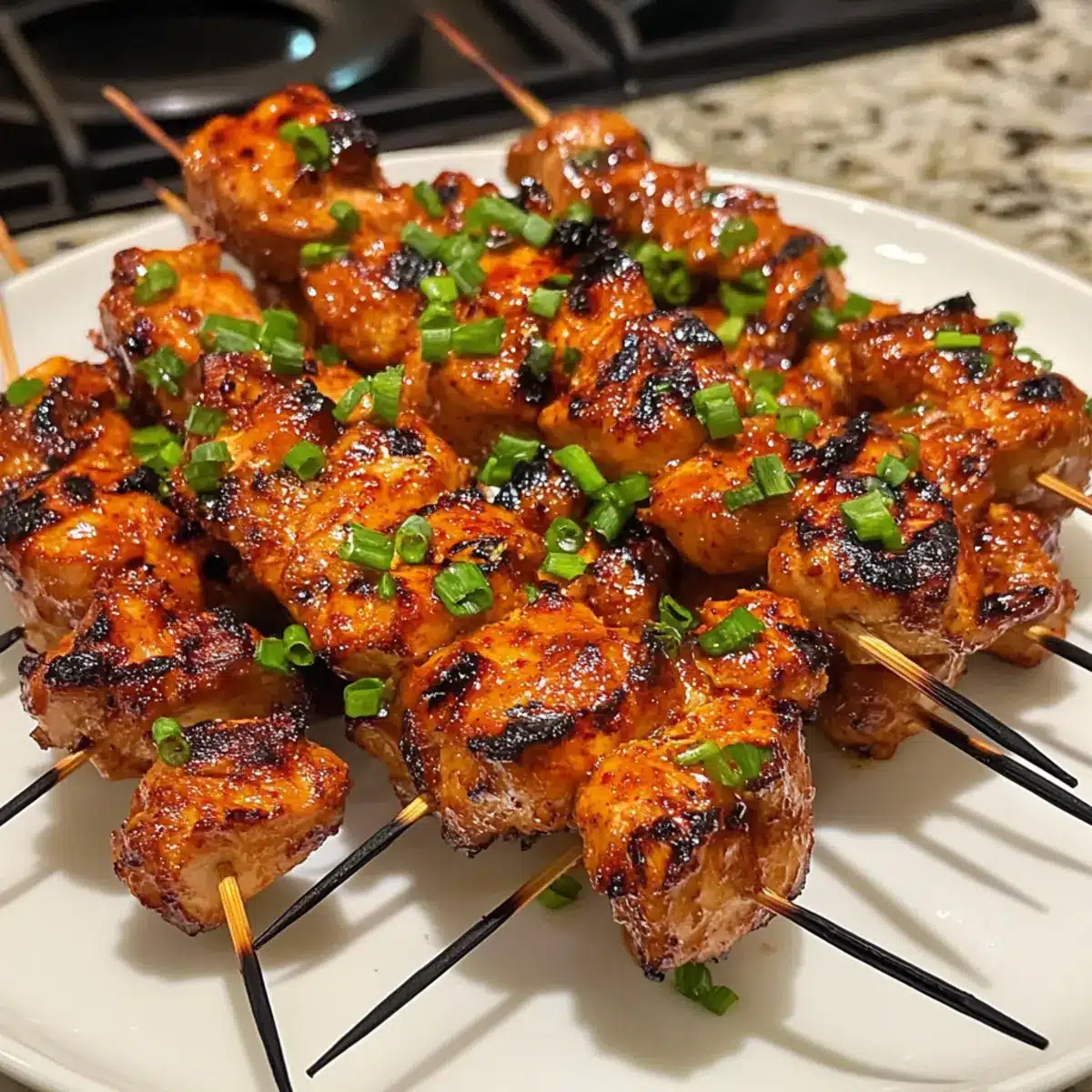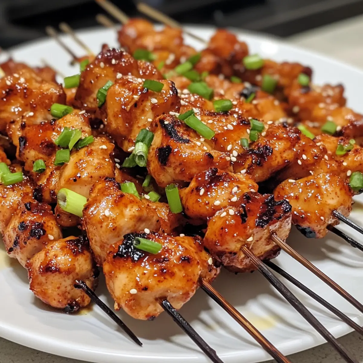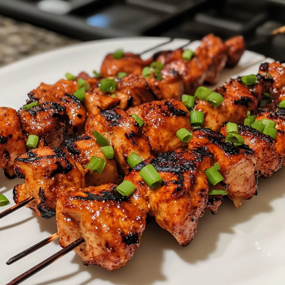 - Once the chicken is perfectly grilled, carefully remove the skewers from the grill. Serve hot, garnished with chopped green onions.