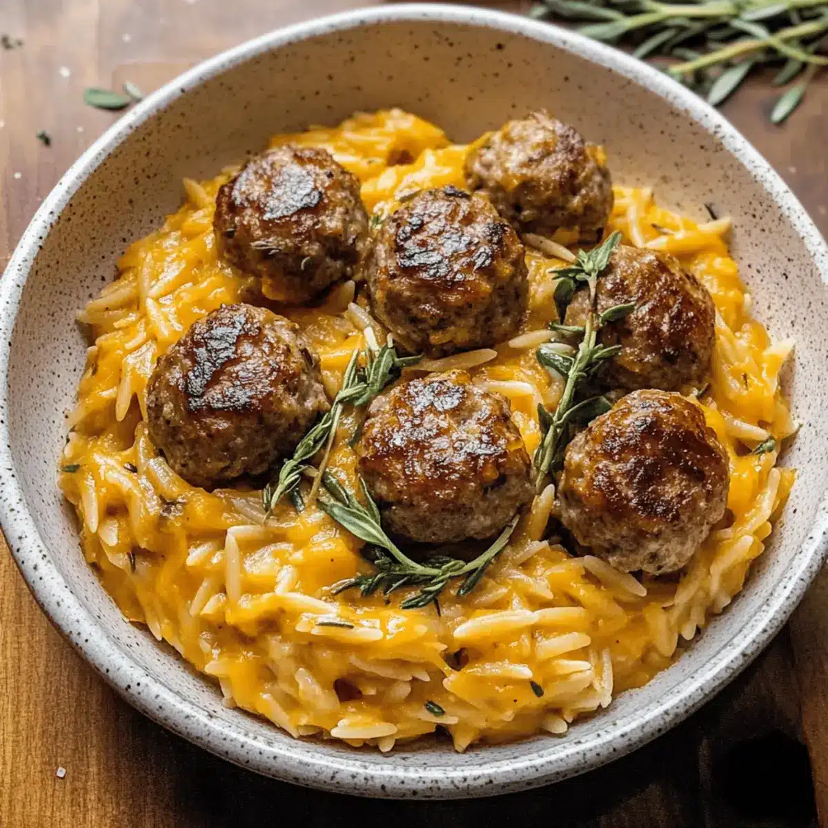 - Serve orzo topped with baked meatballs and garnish with fresh thyme.