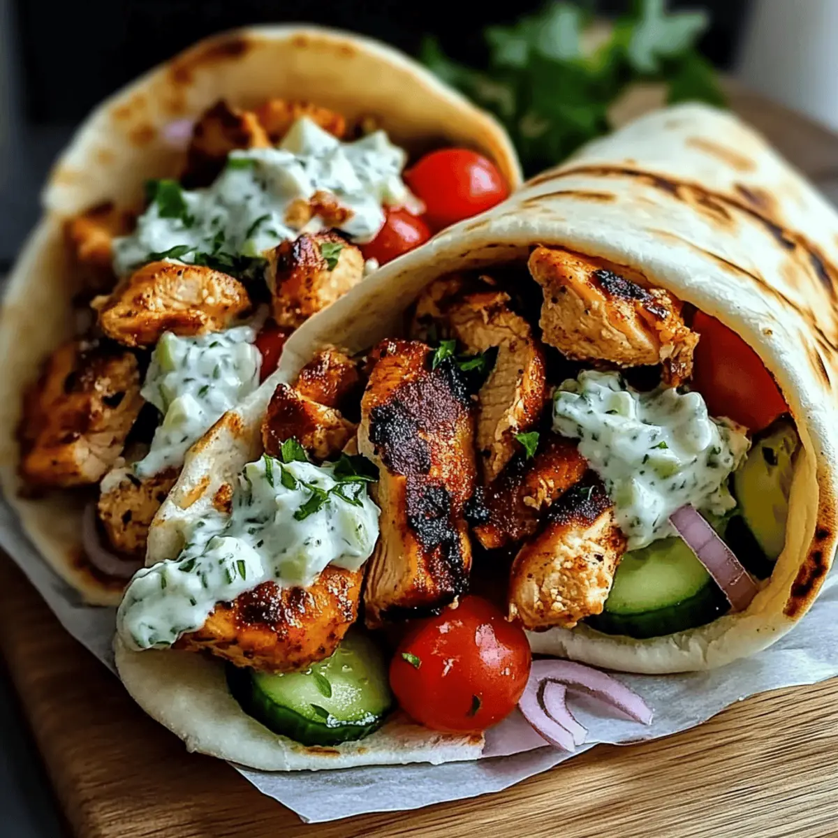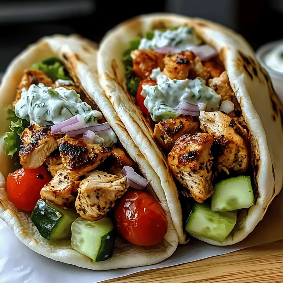 Once the chicken is cooked, remove it from the heat and let it rest for a few minutes. Slice the chicken into strips, then warm your pita bread slightly in the skillet or microwave. Spread a generous amount of creamy feta tzatziki on each pita, add the chicken strips, and top with cherry tomatoes, cucumber, and red onion for a burst of freshness.