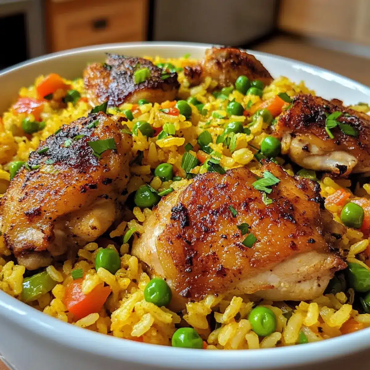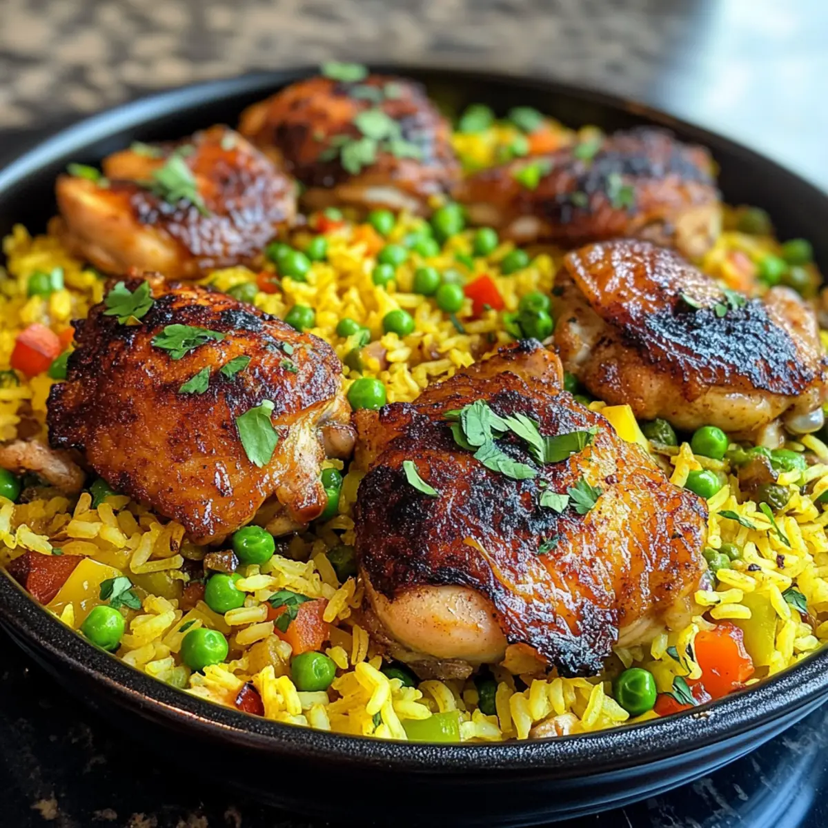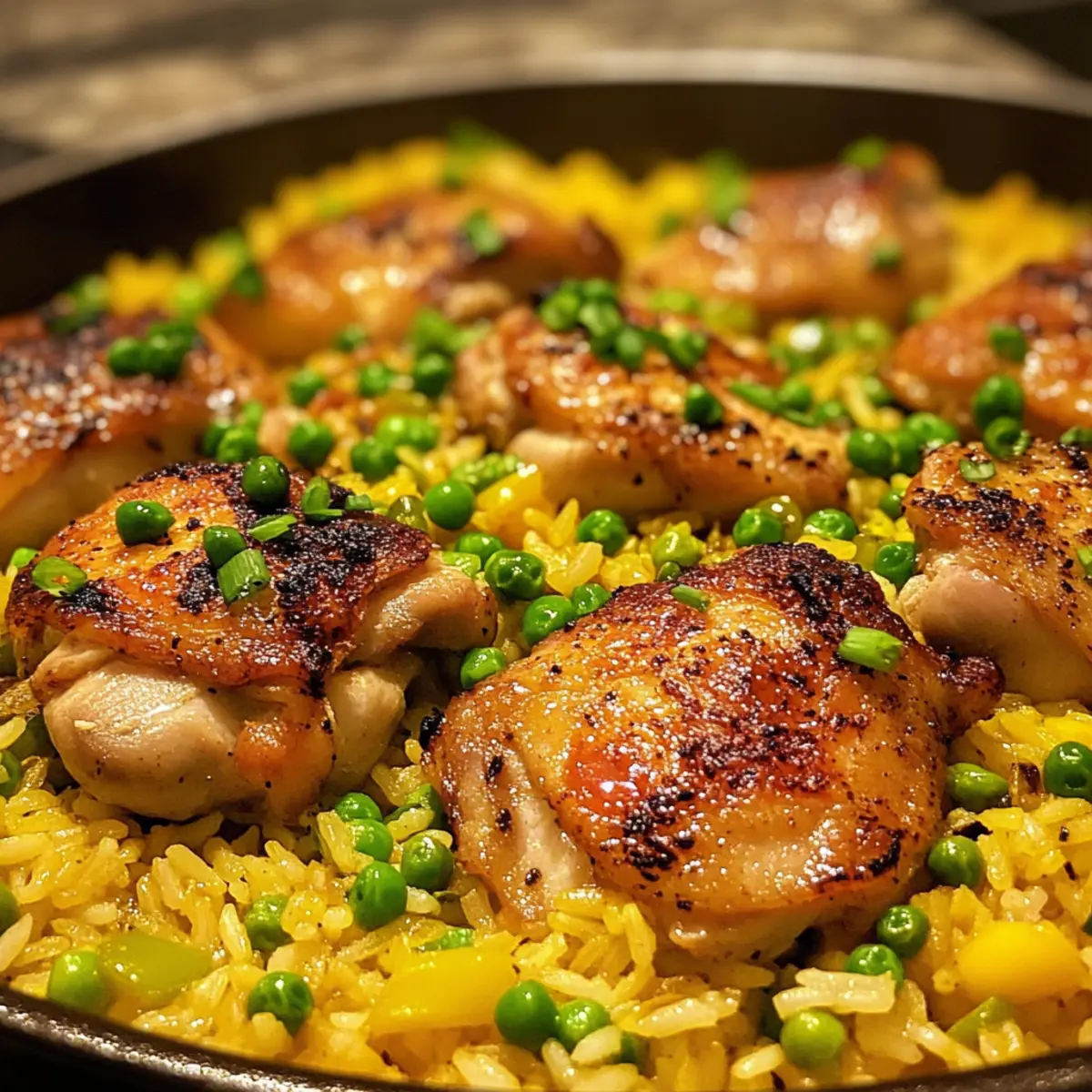 Stir in the basmati rice, ensuring it gets coated with the aromatic mixture and oil for about 1 minute. Pour in the chicken stock and sprinkle in the turmeric powder, giving everything a gentle stir. Then, add the frozen peas (if using) and carefully place the seared chicken thighs back on top without stirring, keeping them intact for optimal flavor.
