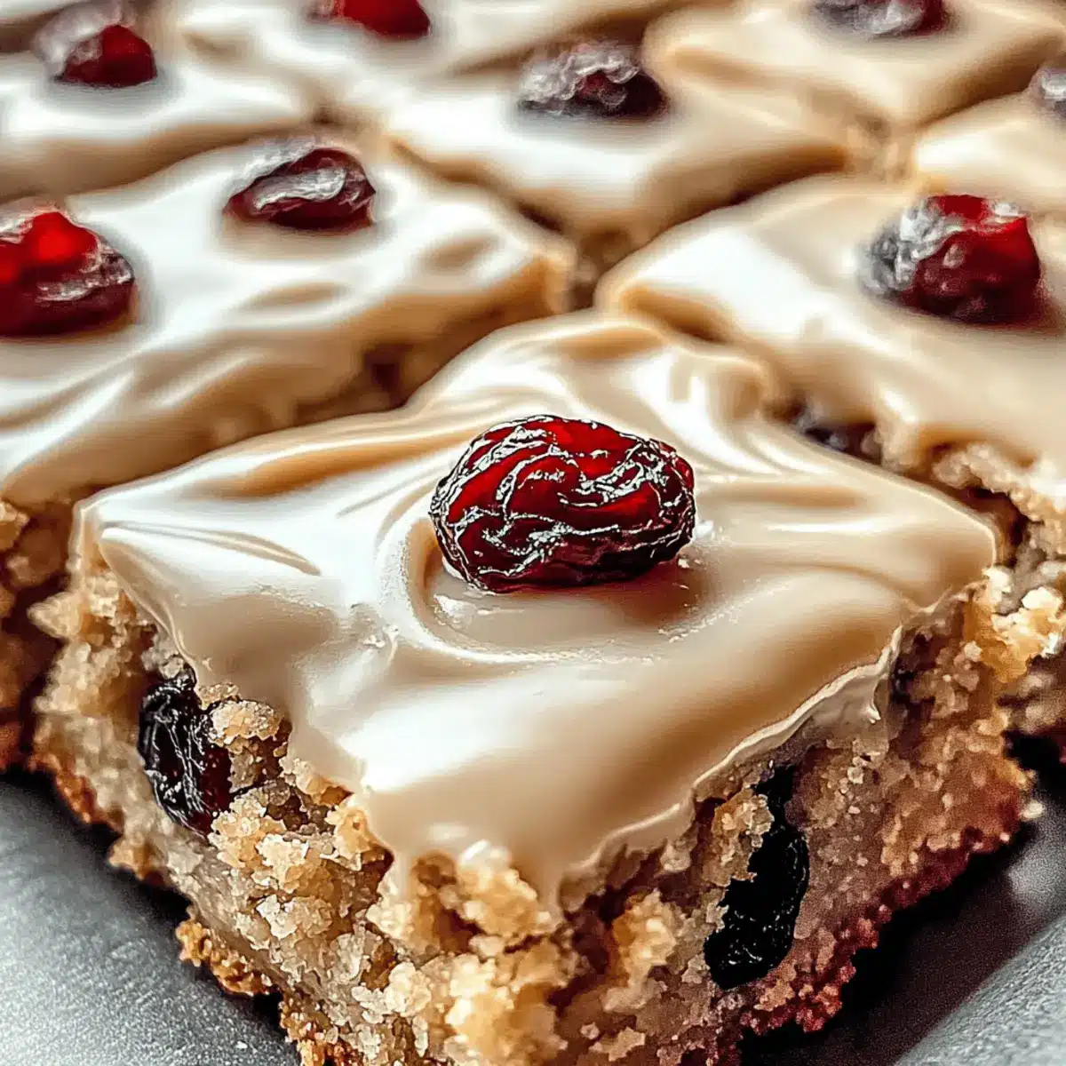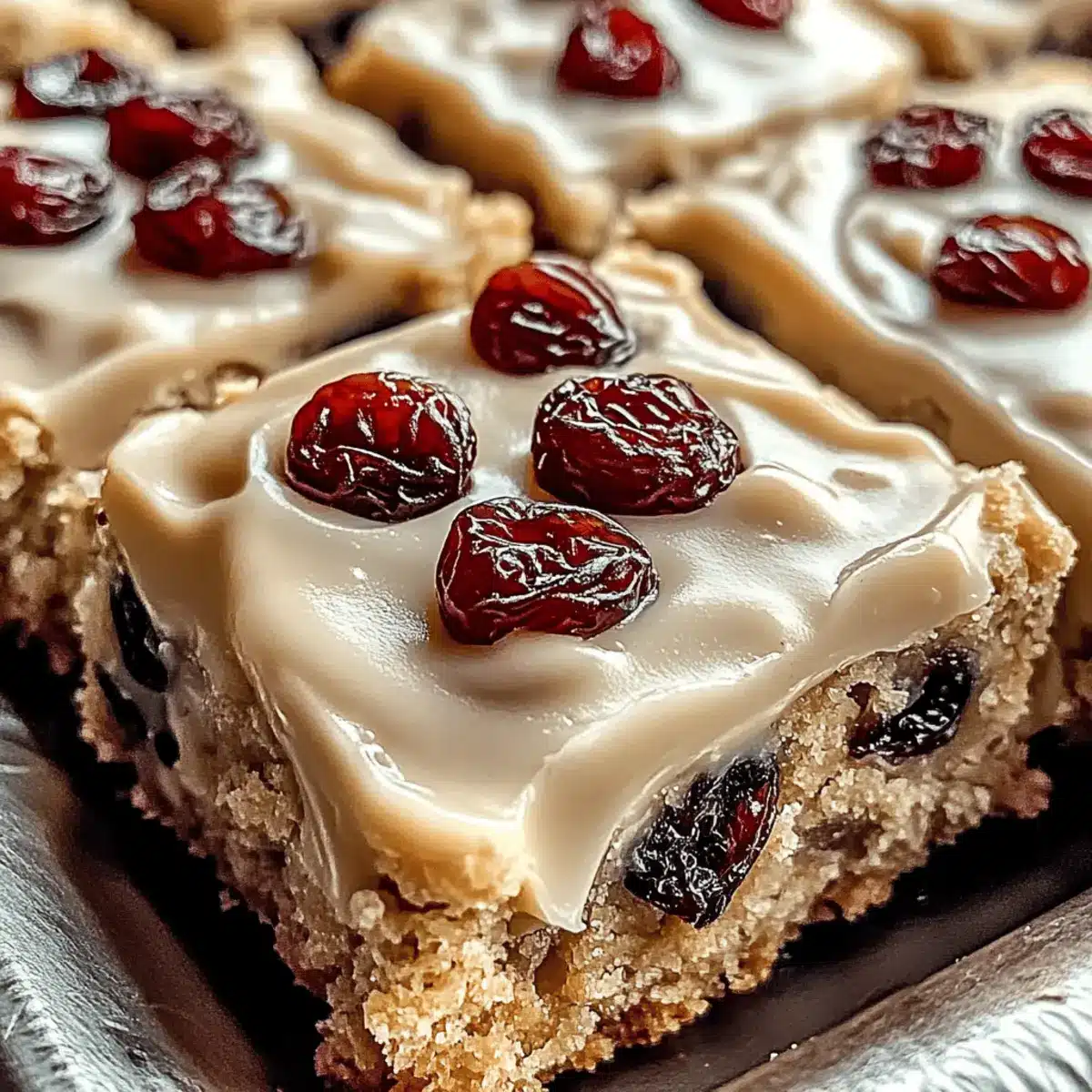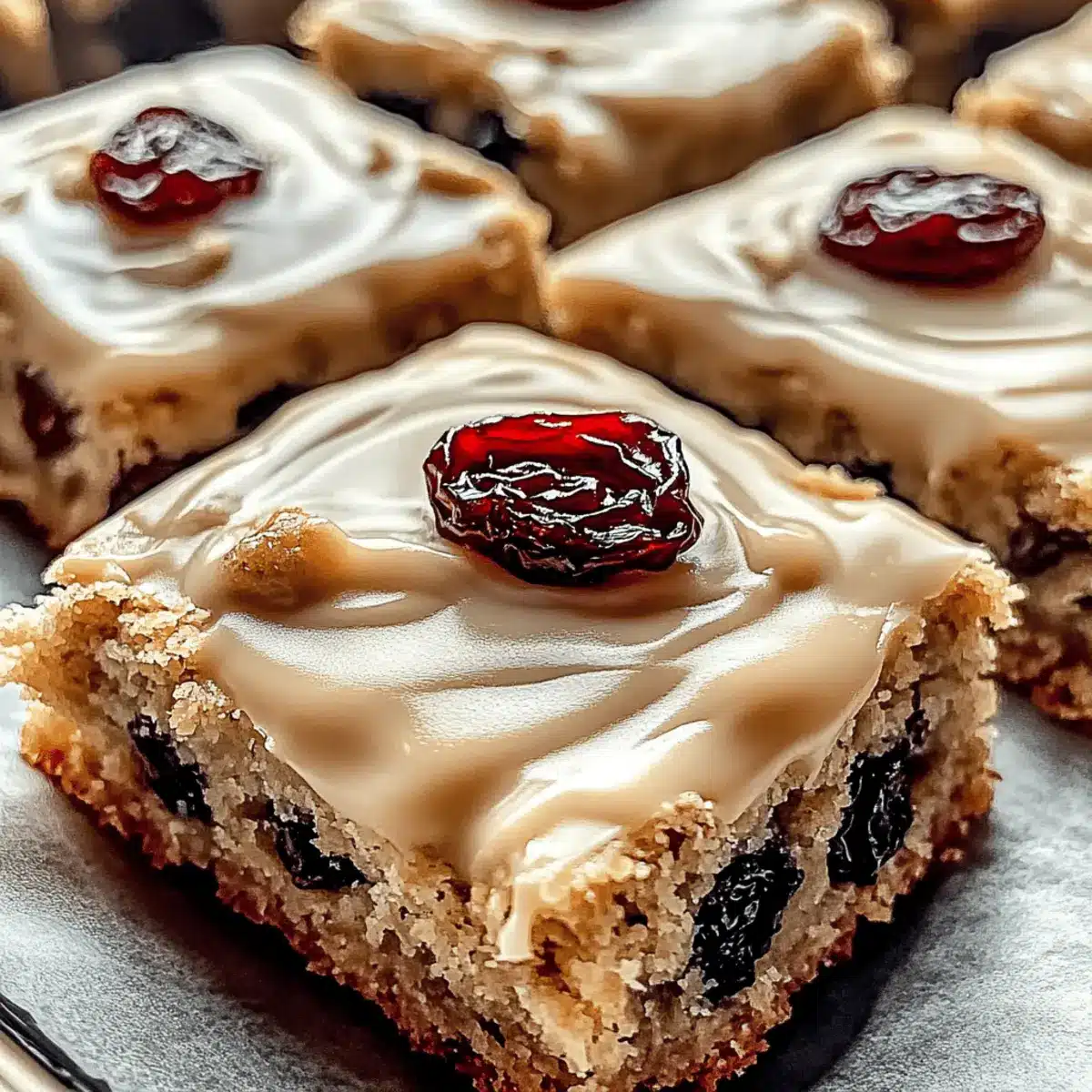 Delight in these Oatmeal Raisin Cookie Bars, enhanced by rich maple-cinnamon frosting, perfect for any sweet craving.