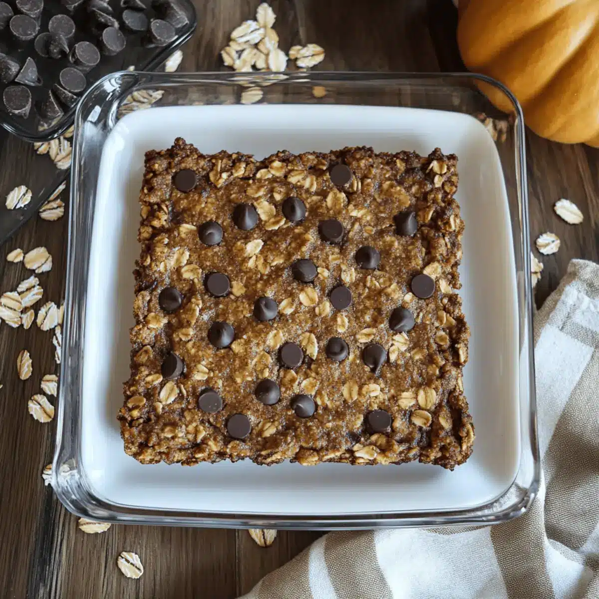 These Pumpkin Chocolate Chip Oat Bars are perfect for meal prep enthusiasts looking to save time during busy weeks! You can prepare the base mixture up to 24 hours in advance. Simply combine the gluten-free oats, pumpkin puree, almond butter, maple syrup, eggs, and spices in a bowl, then cover it tightly and refrigerate. This not only enhances the flavors but ensures everything is ready for baking at a moment’s notice. When you’re ready to indulge, just fold in the chocolate chips, spread the mixture in your greased baking dish, and bake as per the recipe’s instructions. You’ll have delicious bars that are just as fresh and delightful as if made that day!