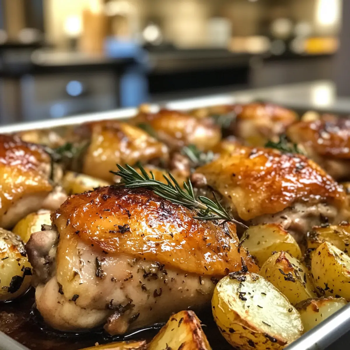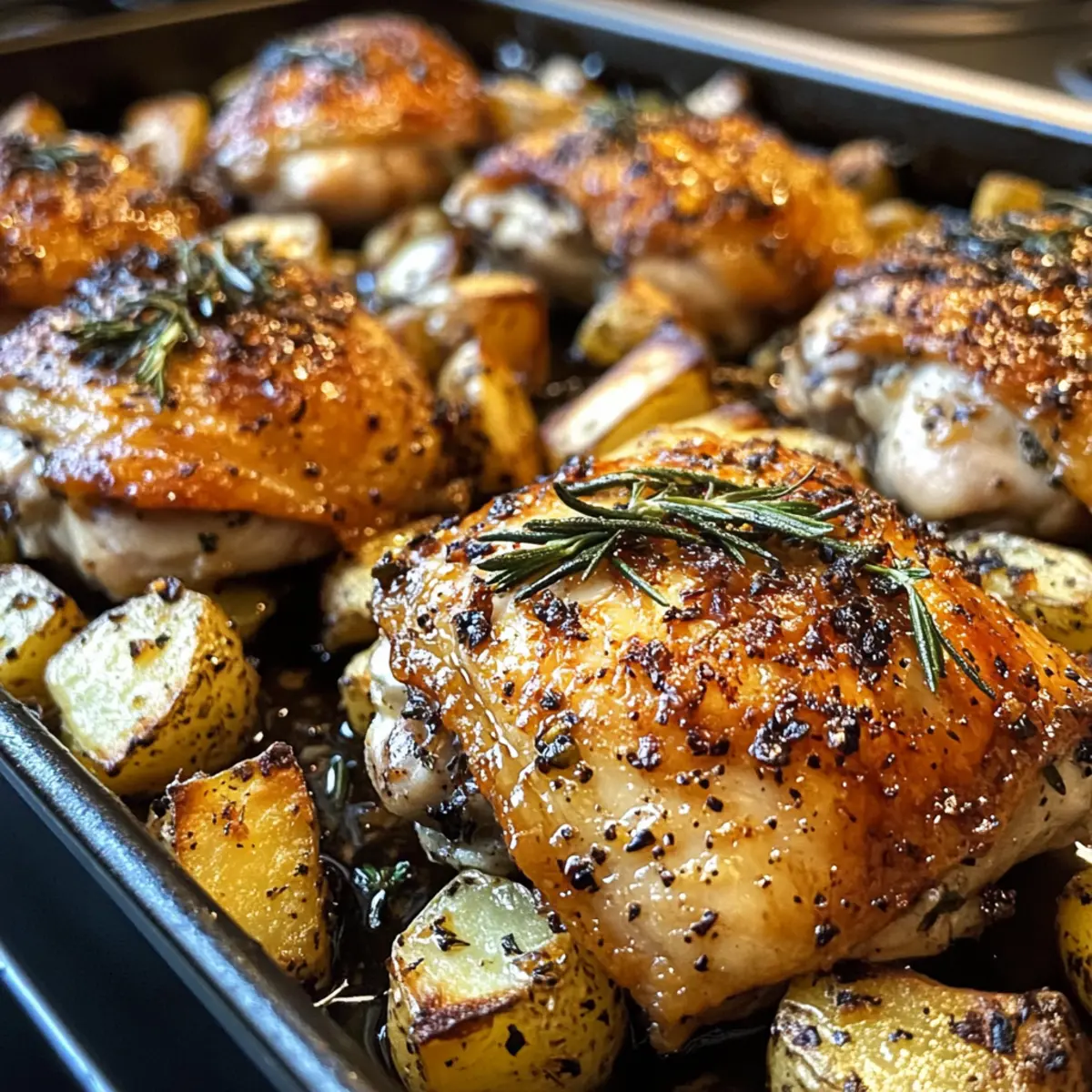 Enjoy a cozy dinner with Rosemary and Thyme Chicken Thighs, perfectly seasoned and roasted with potatoes.
