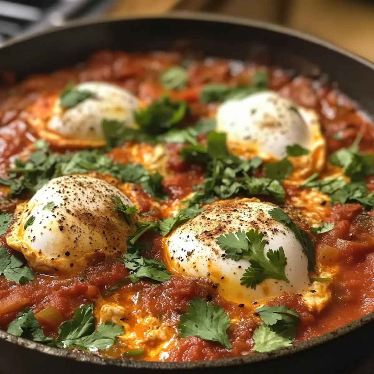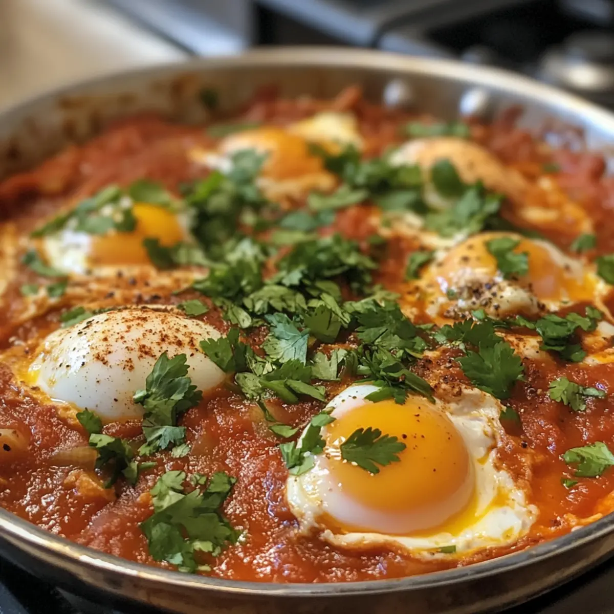 Once the eggs are cooked to your liking, remove the pan from the heat. Sprinkle a handful of chopped fresh cilantro and parsley over the shakshuka for a burst of color and freshness. Serve immediately with warm pita, naan, or crusty bread, inviting your family and friends to enjoy this delightful dish together!