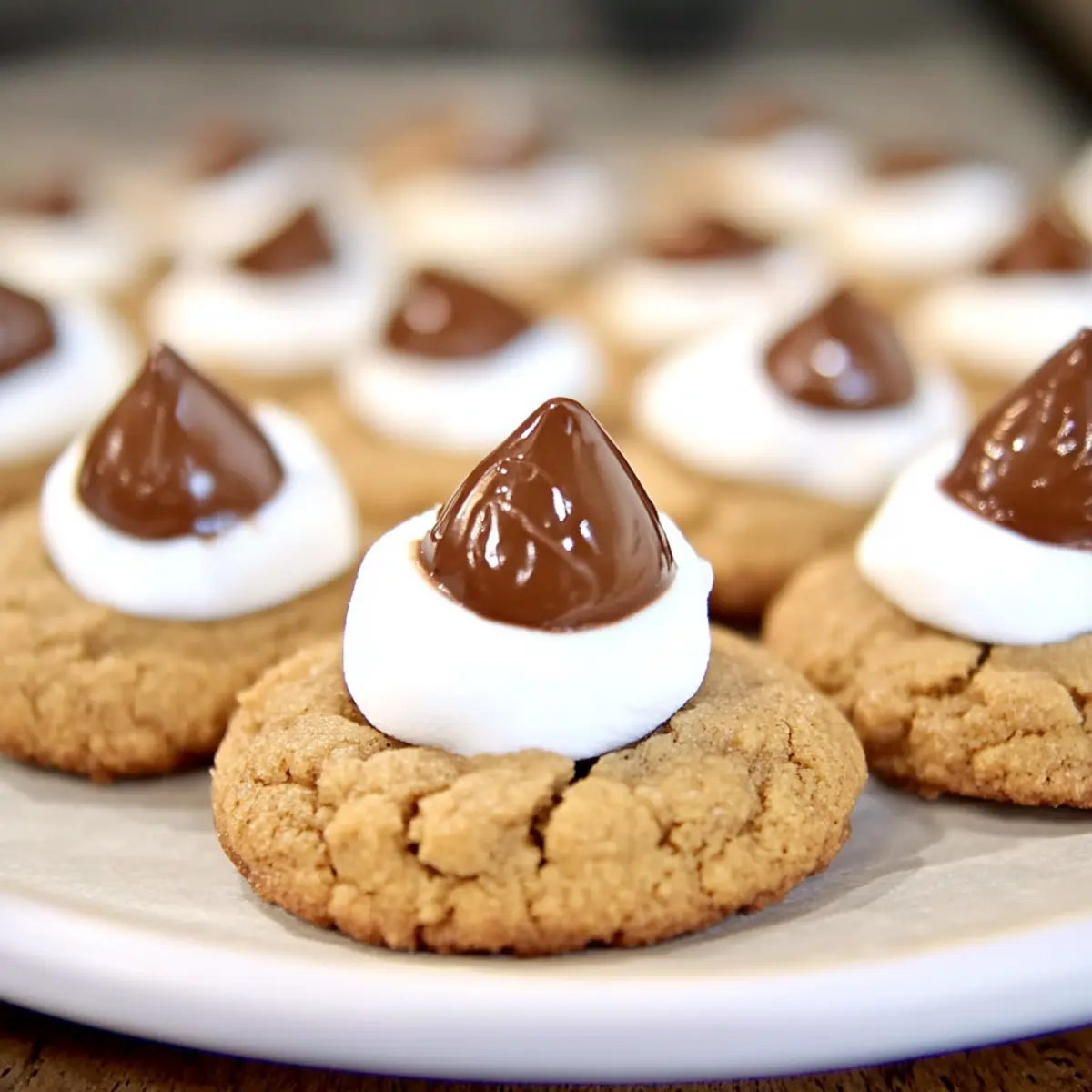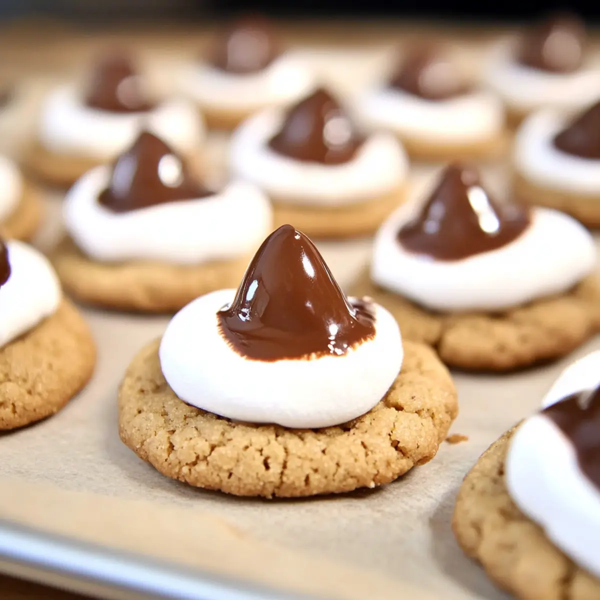 - Top each marshmallow with a Hershey Kiss and allow cookies to cool completely.