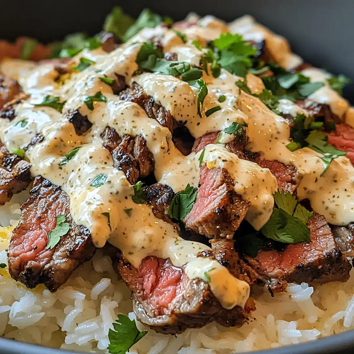 After the steak is cooked, remove the skillet from heat and fluff the rice one last time. Layer the cooked steak strips atop the fluffy rice and then drizzle generously with warm white queso, allowing it to melt into those delicious layers, creating a creamy topping for your Steak & Queso Rice.