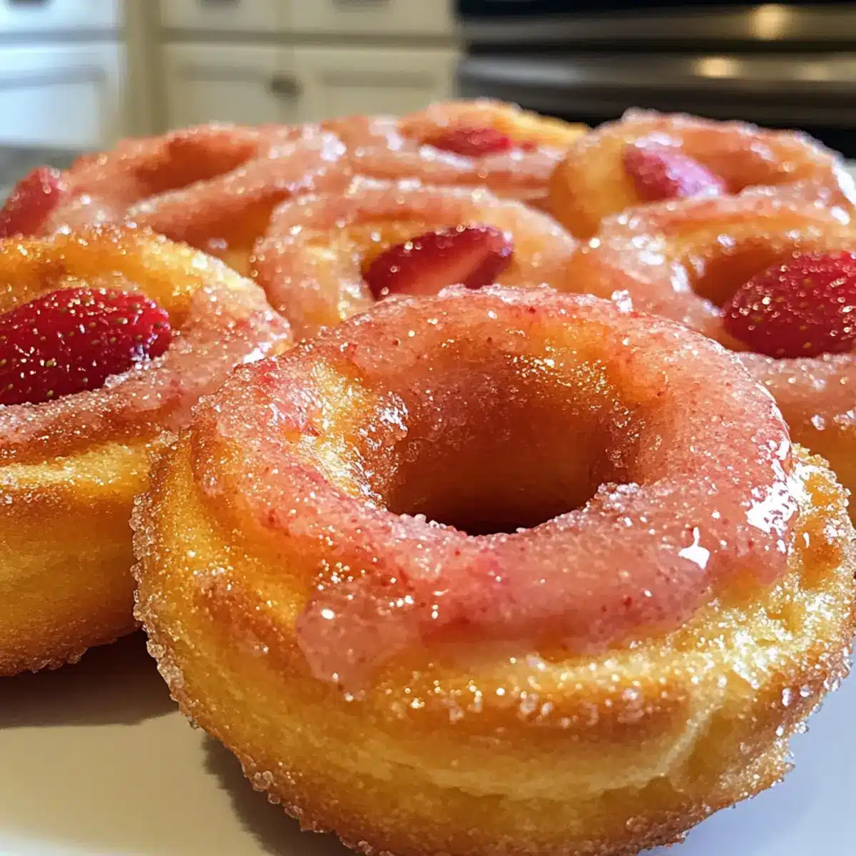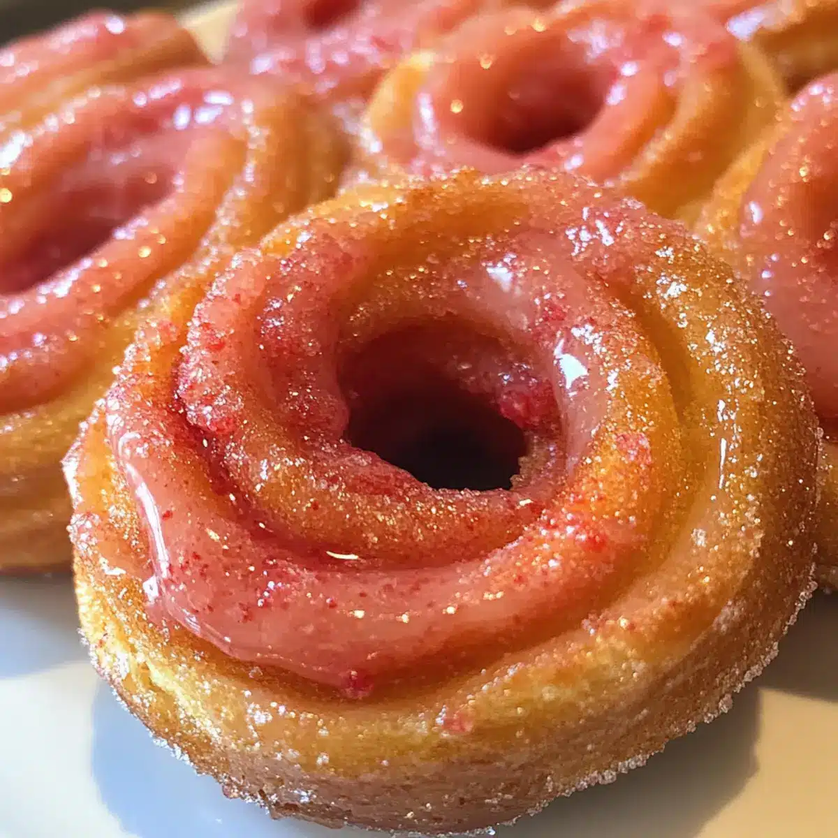 Dip each cooled cruller in the homemade strawberry glaze and then sprinkle generously with strawberry sugar. Return the glazed crullers to the cooling rack, allowing the glaze to set slightly. You’ll see a vibrant finish that glistens beautifully, ready to be enjoyed fresh and warm.