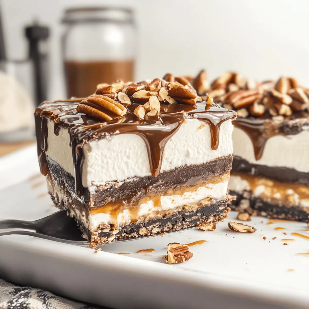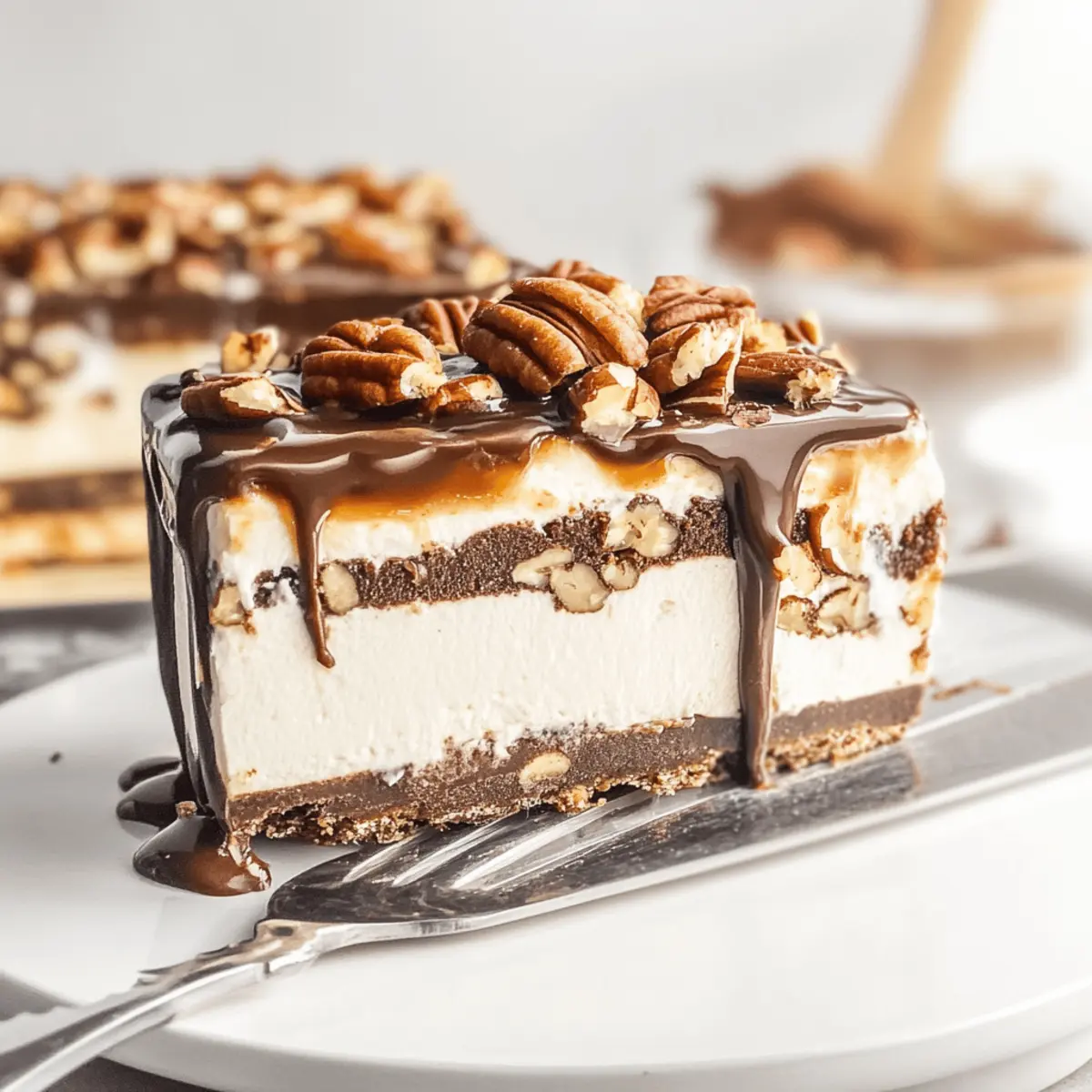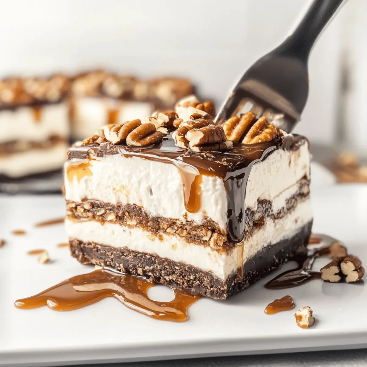 Experience the delightful layers of Turtle Lush, a no-bake dessert combining chocolate, caramel, and crunchy textures.